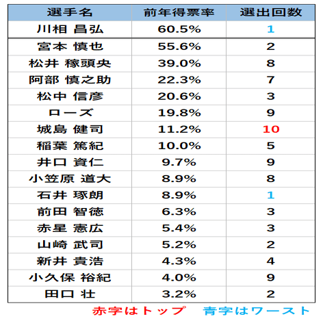 ただし、川相を上回る7回受賞の井端弘和が、候補者1年目で得票率2.8%にとどまり資格を喪失しているという事実もあります。
