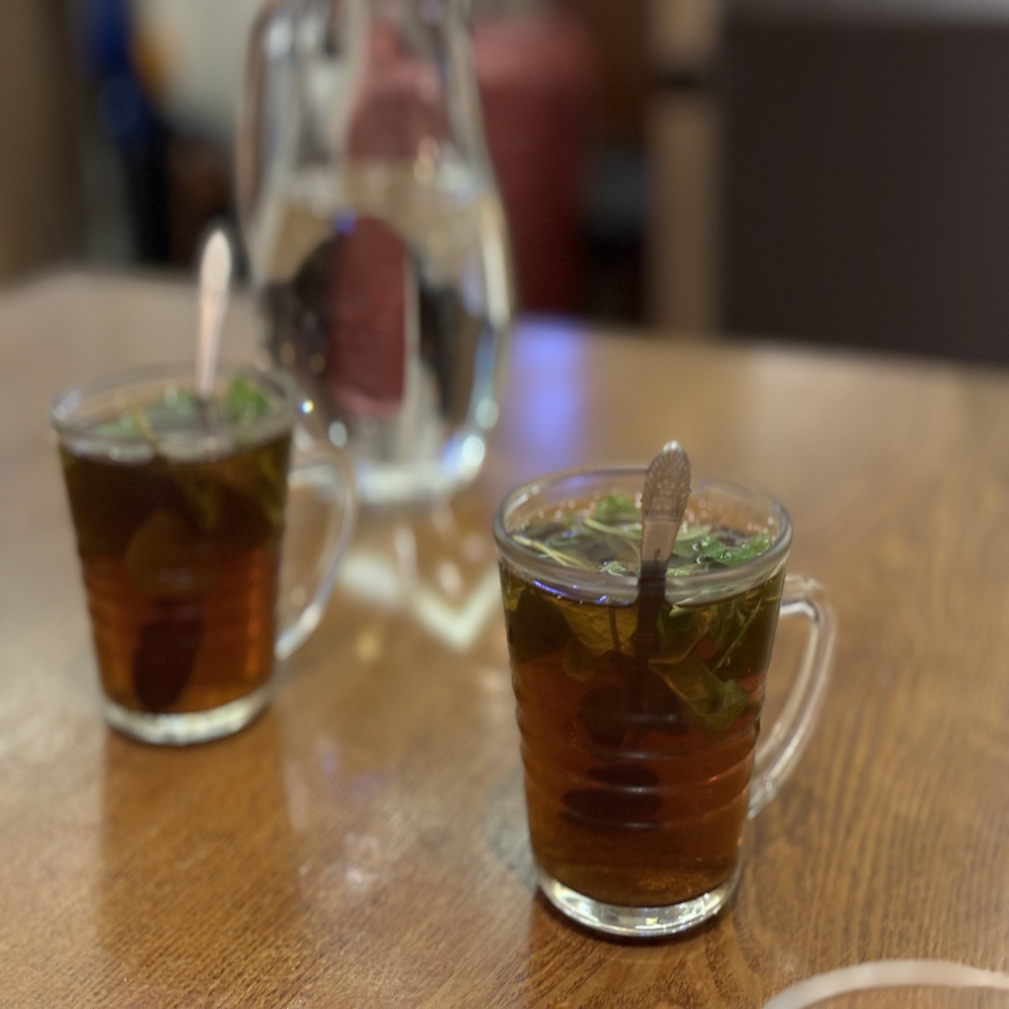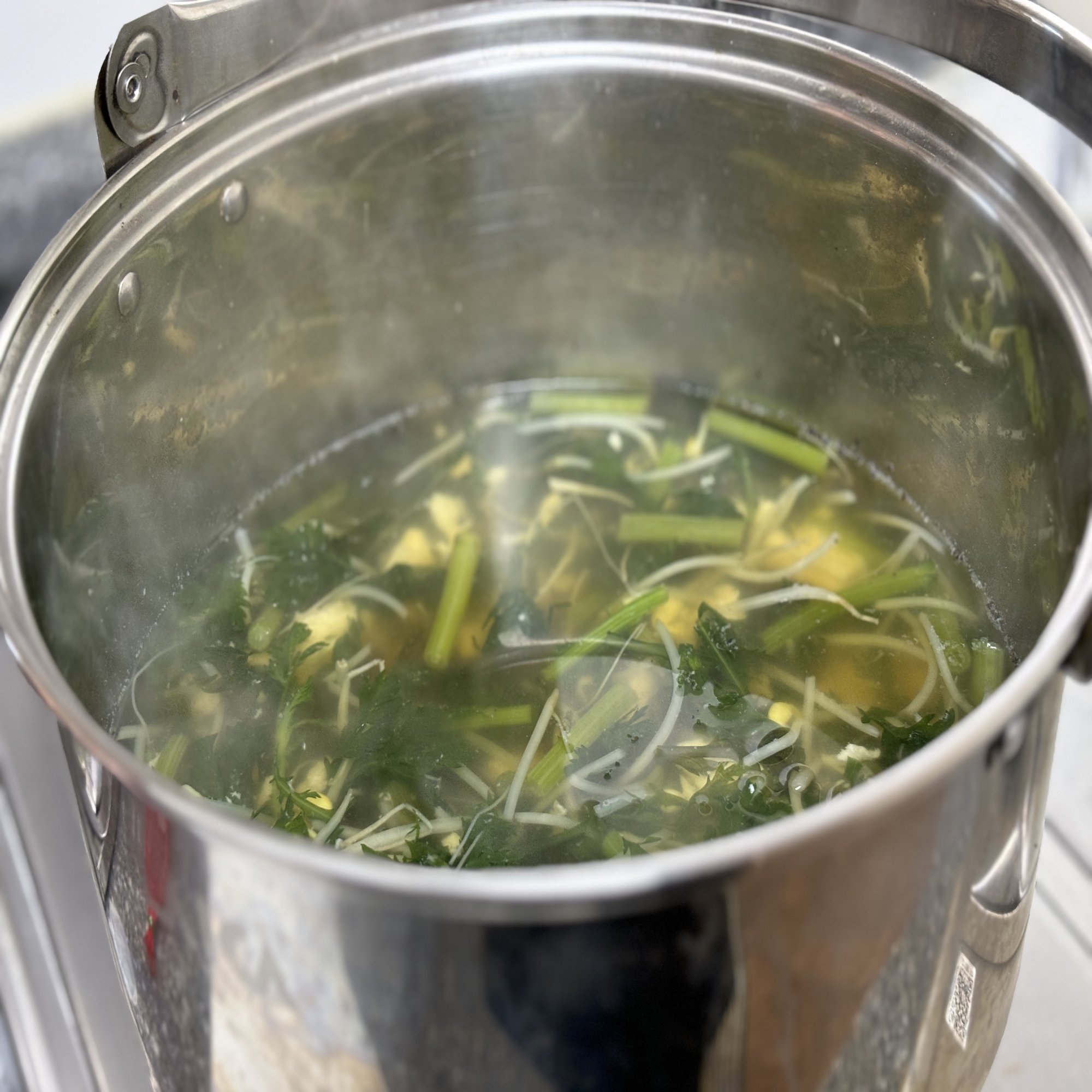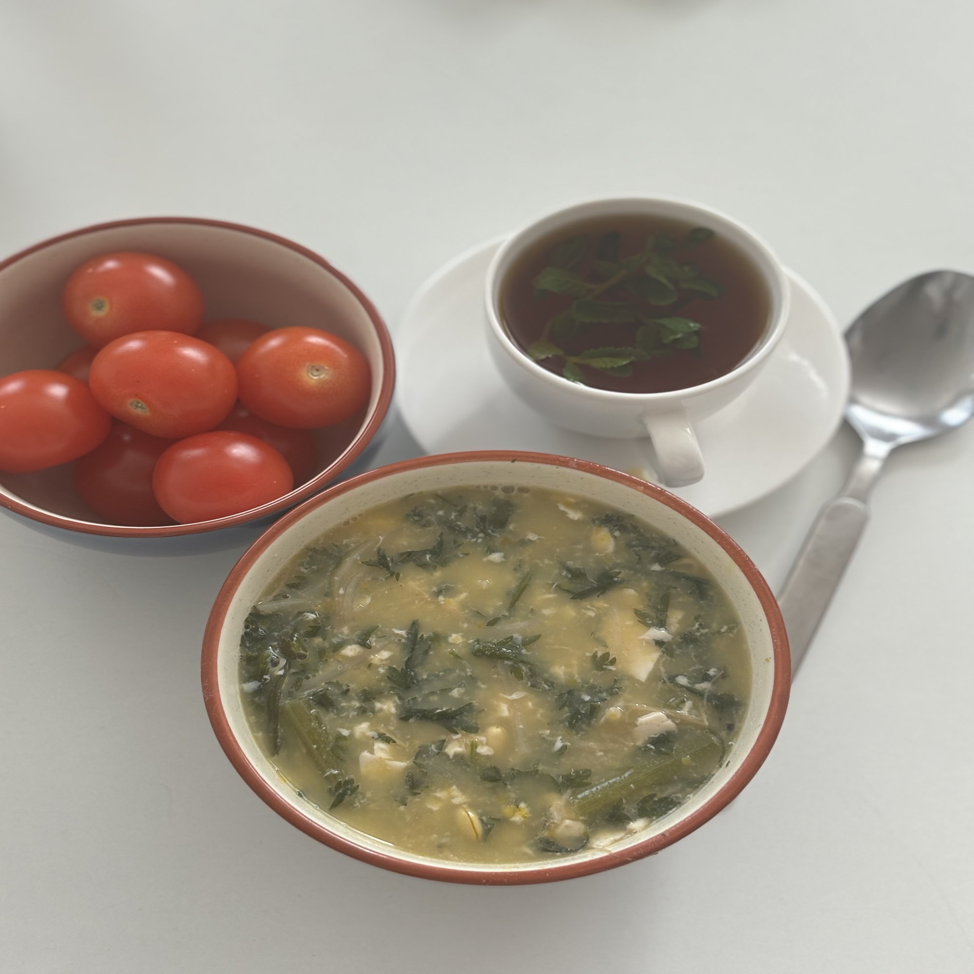 これが二日酔いに染み入る優しいお味の「豆腐海苔よくわからない春菊みたいな野菜入りのかき卵スープ」。〜ミントティーを添えて〜