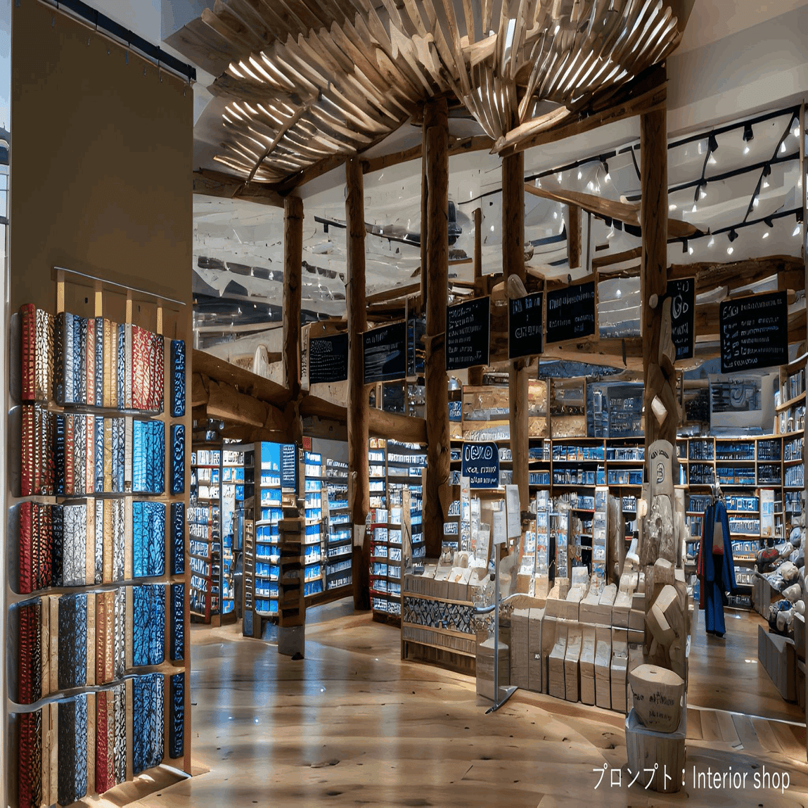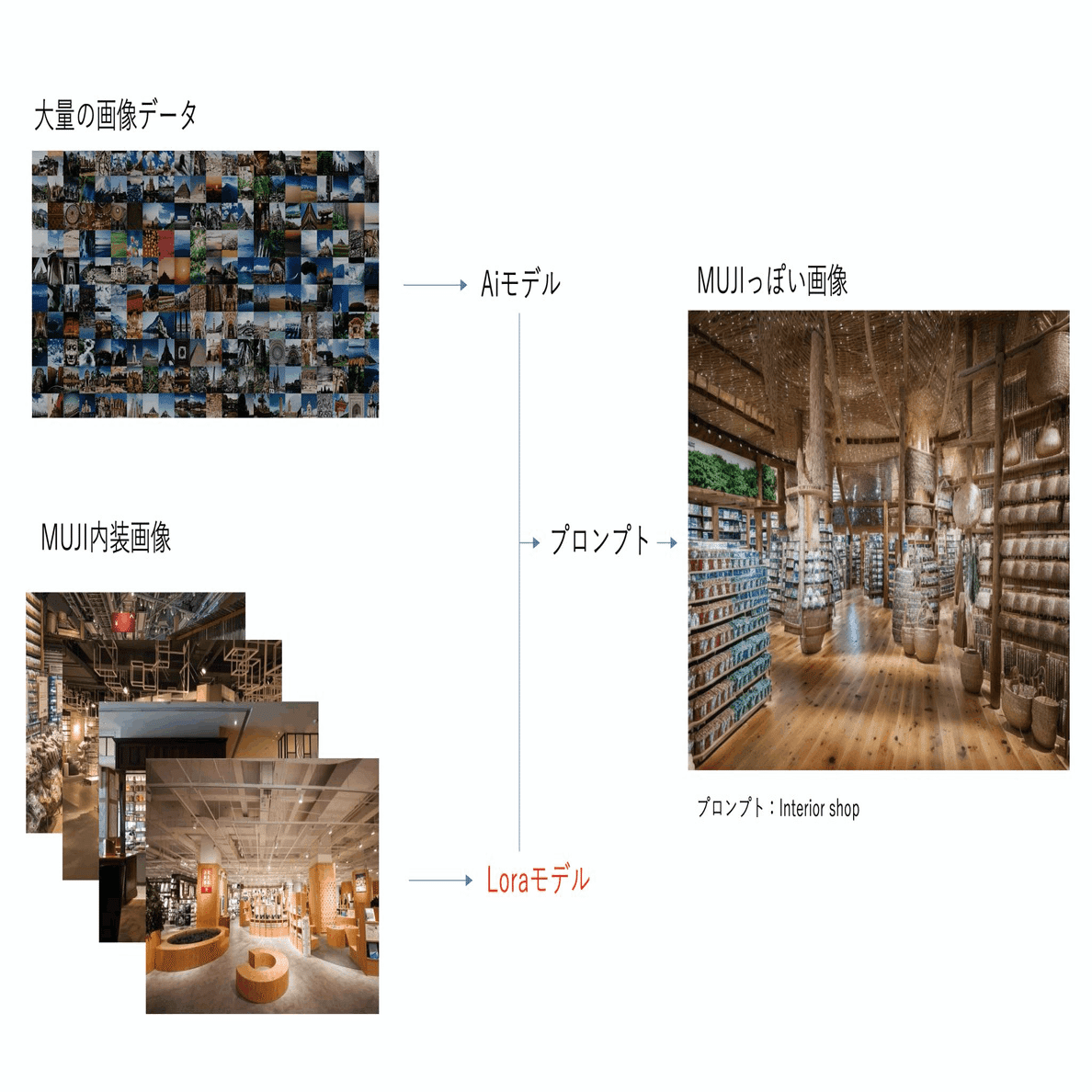例えば、無印良品店の内装の画像を集め無印良品店のような内装を生成するLoRAを作成することもできます。