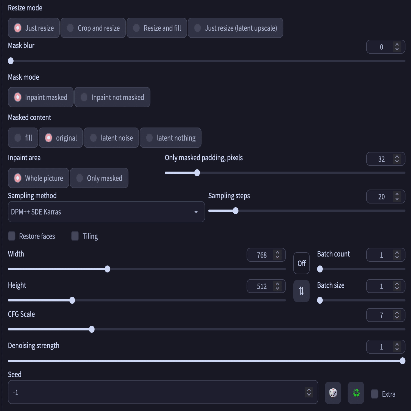 img2imgの設定項目は以下のような数値に設定しています。