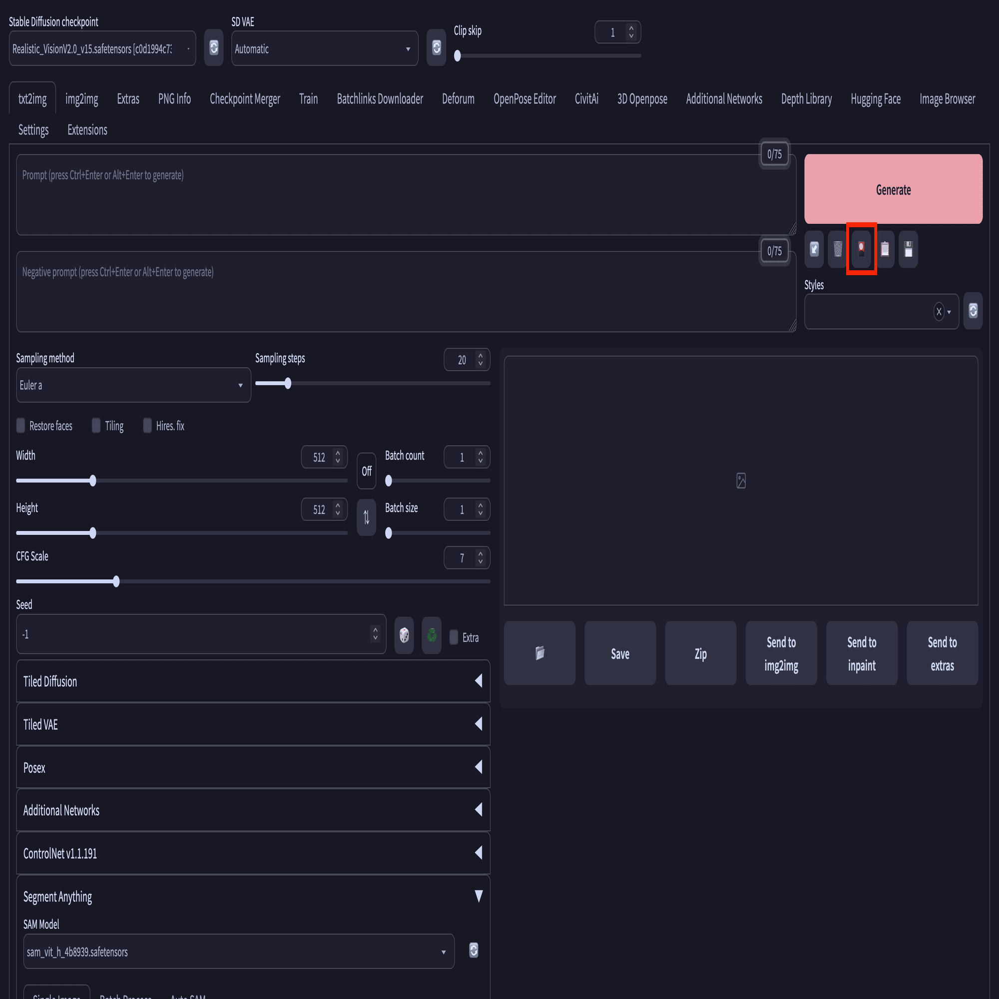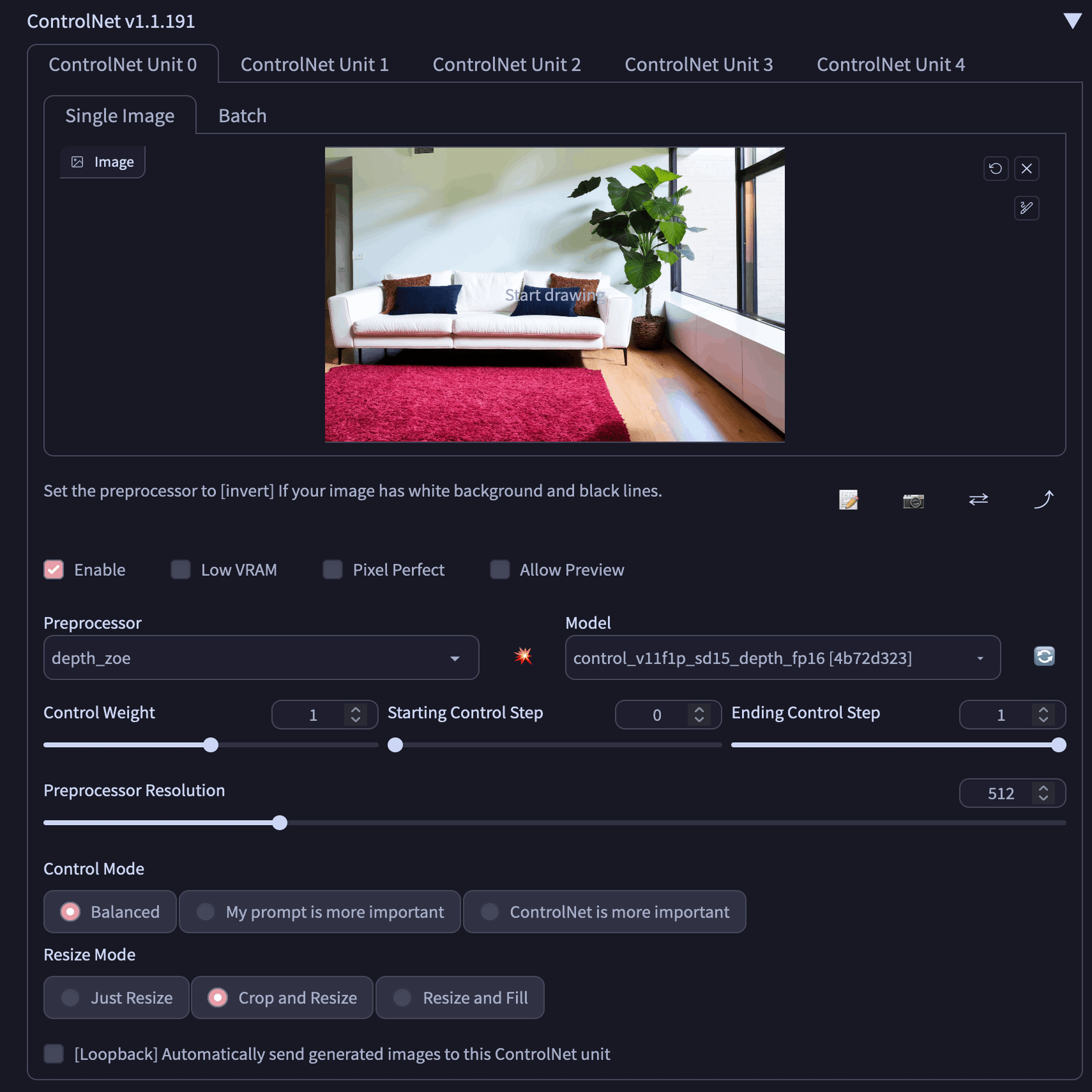 以下はControlNetのDepthを使用する際の設定になります。