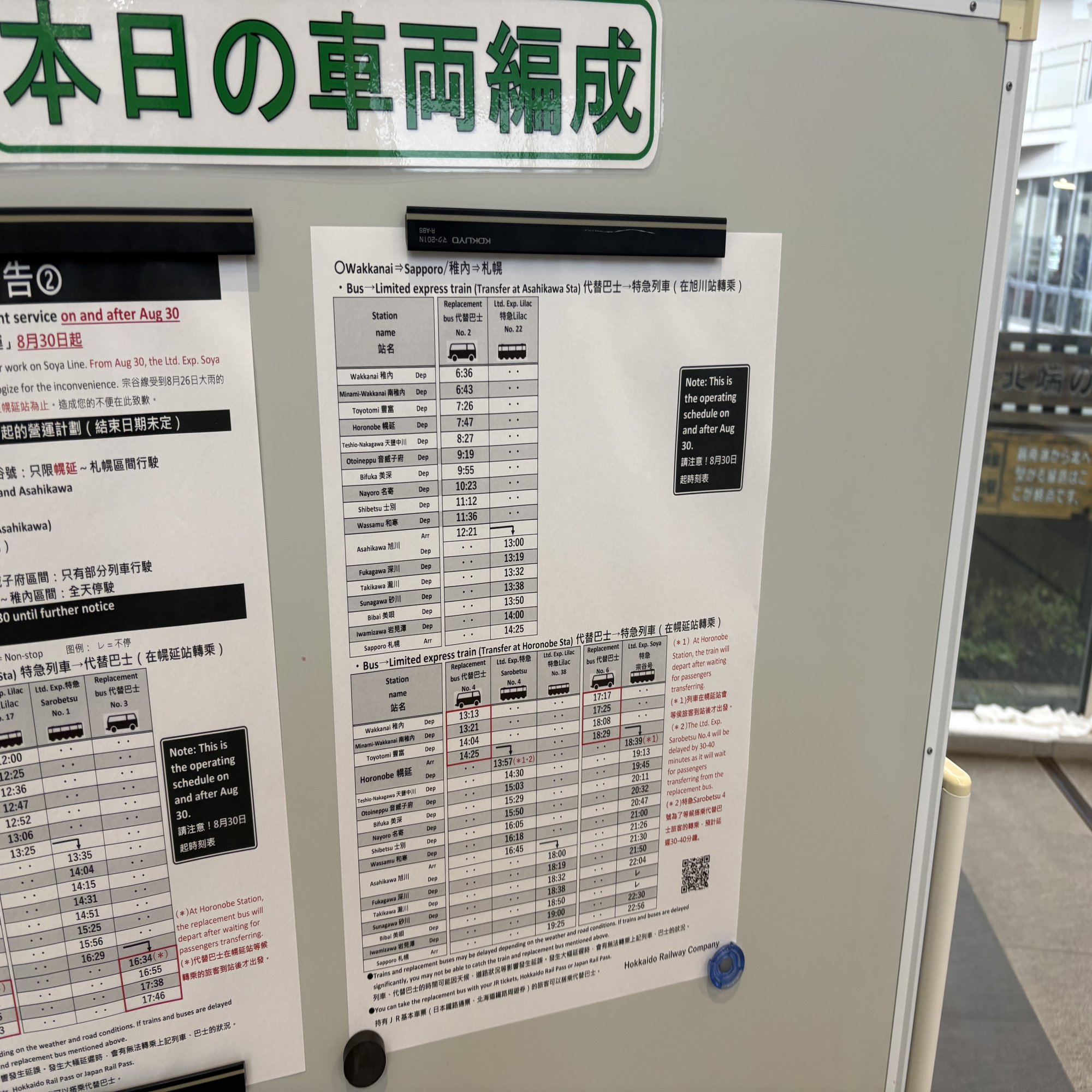 よく見たらけっこうわかりやすい場所に代替の交通機関に関する案内が貼りだされていた。どうも運休の列車のかわりに代替バスが走るらしい。