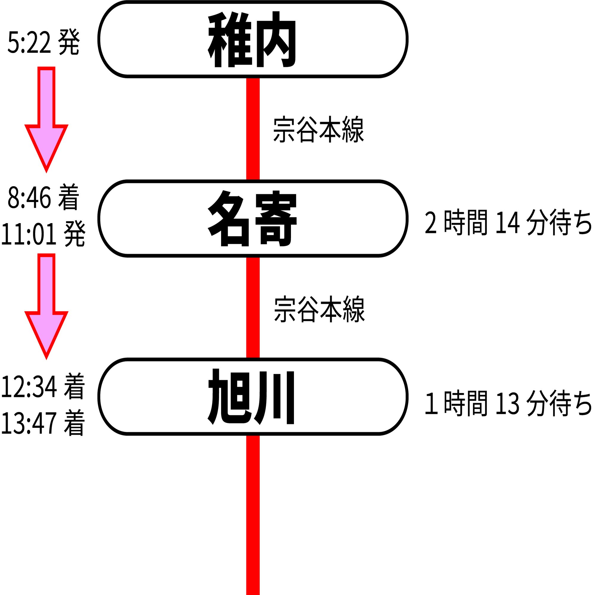 従来より遅い時間に出発し、鉄道より時間のかかるバスなのに、しっかりと同じくらいの時間に旭川駅に到着する。これは、名寄駅での異常な乗換え時間に起因する。