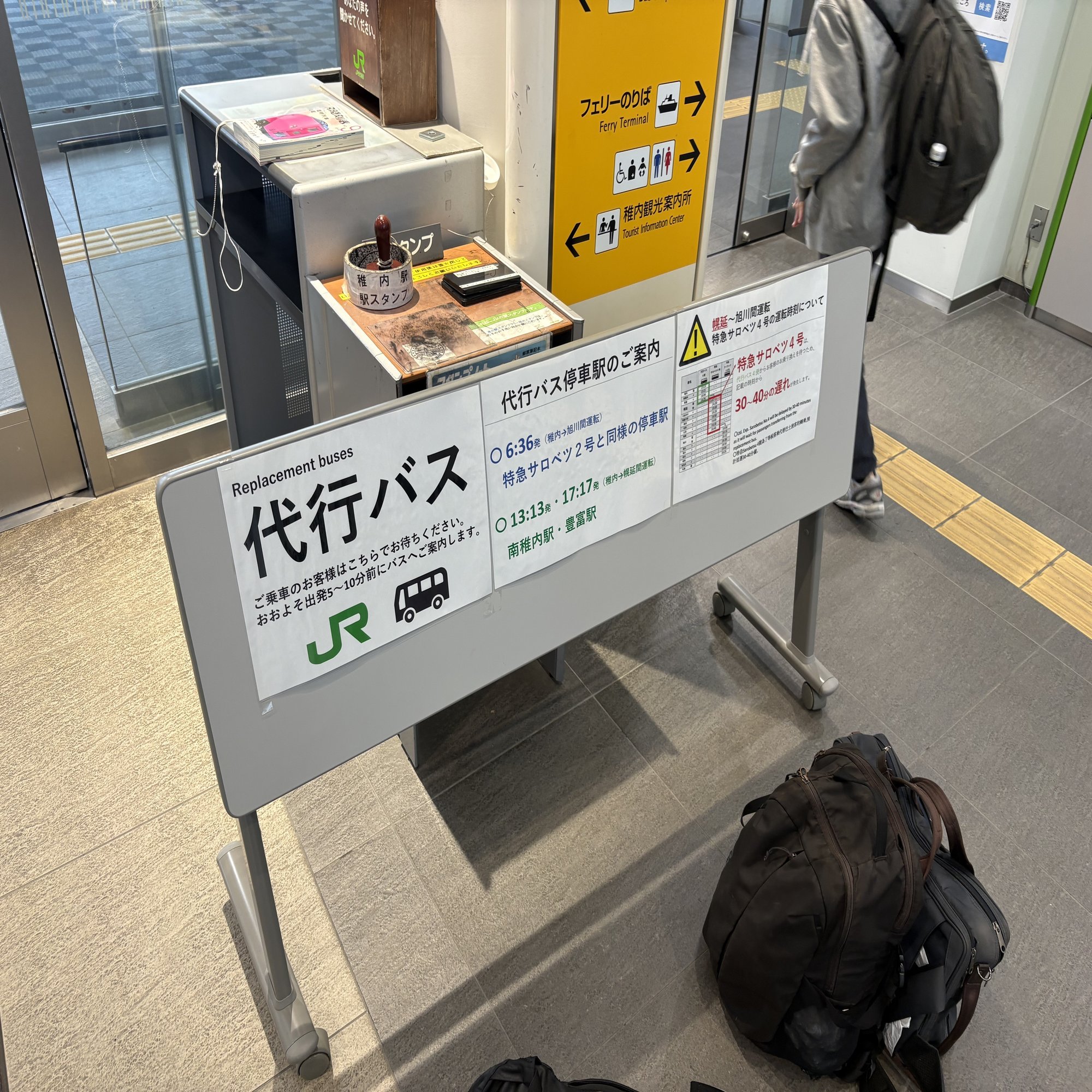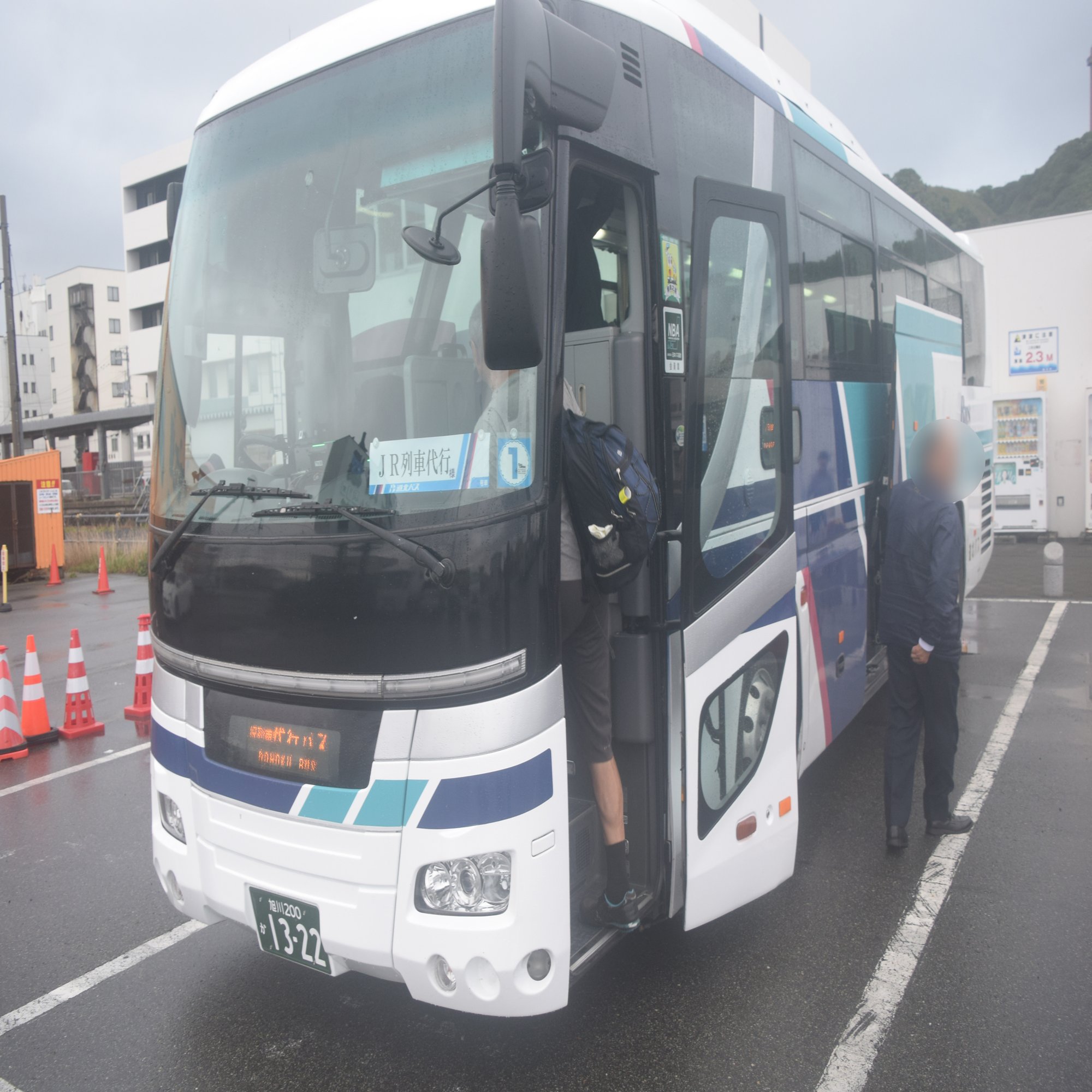 ここを代替バスで行くのだけど、基本的に代替バスは鉄道で移動するより時間がかかる。さらに、始発より1時間以上は遅れての出発になるので、旭川到着がかなり遅くなるのではと心配された。そうなるとそのあとの旅程がぜんぶ狂うわけだ。
