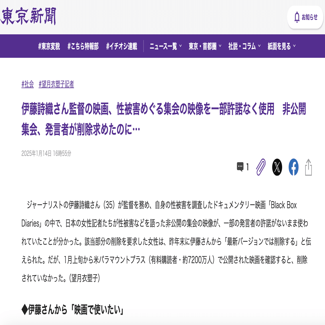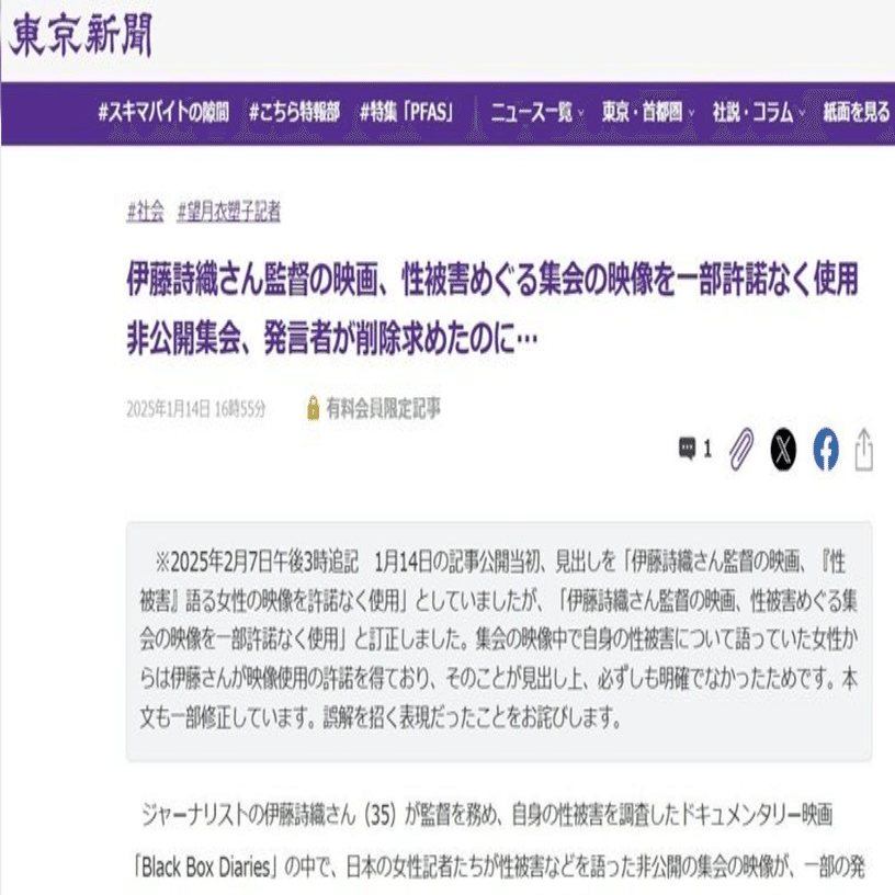 東京新聞は訂正の補足文書を掲載し、記事を一部修正しましたが、見出しは「伊藤詩織さん監督の映画、性被害めぐる集会の映像を一部許諾なく使用 非公開集会、発言者が削除求めたのに…:東京新聞デジタル」です。