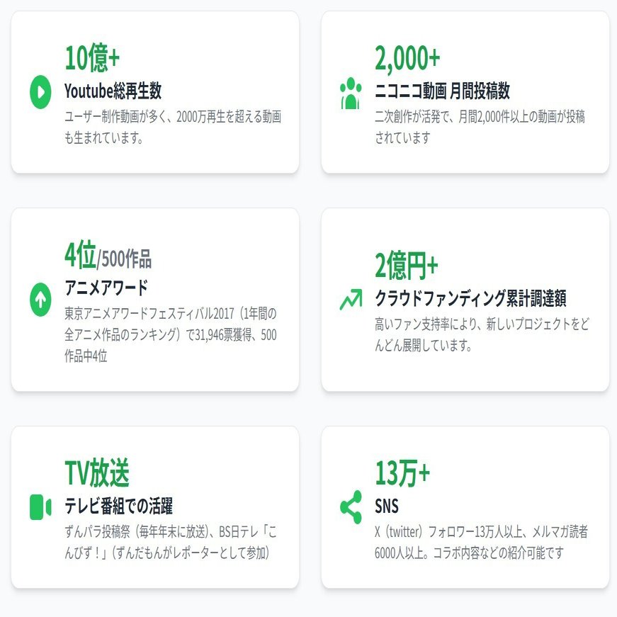 「ずんだもん」もその他のキャラクターと同様に、東北の企業であれば無料で商用利用が可能です。さらにもう一つの特徴として、個人のクリエイターであれば東北在住でなくても、非商用利用に限り無料で使うことができます(その他のキャラクターも同様)。動画配信サイトなどでの広告収入も容認しており、これによって「ずんだもん」は多くの創作活動に使われるようになりました。(プロジェクト実績の引用元はこちら)