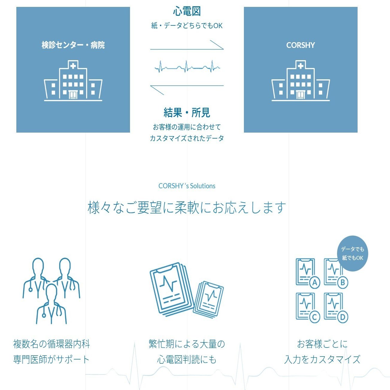 「コルシー」は、医療機関から送られてきた心電図データを循環器専門医が遠隔で判読し、所見を返却するサービスです。