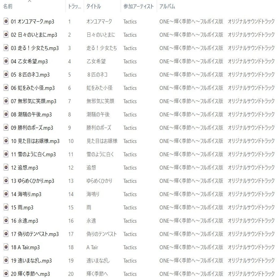 C:\user\ユーザー名\music\Tactics\ONE~輝く季節へ~フルボイス版 オリジナルサウンドトラックに全トラックのmp3ファイルが記録される