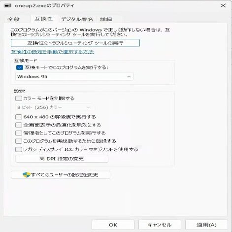 互換性タブを開く。互換モードでこのプログラムを実行するチェックボックスをONにする。OSの選択メニューからはWIndows95を選択して適用ボタンを押下する