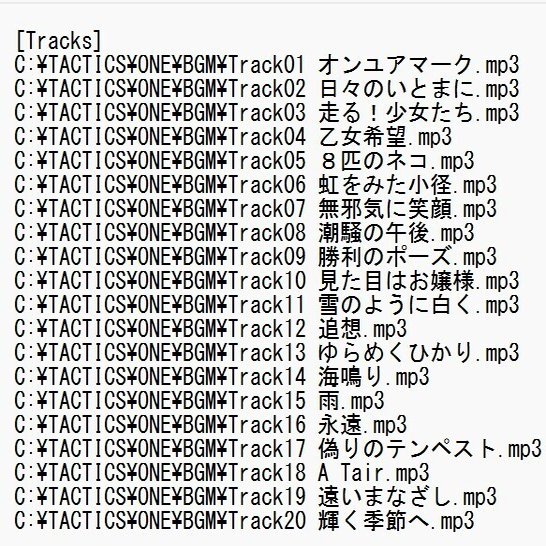 2行目が例えば、C:\Tactics\ONE\BGM\Track01 オンユアマーク.mp3であり、BGMフォルダ内のMP3ファイルとファイル位置が一致していること(ファイル位置が違う場合は実際のファイル位置に合わせて_inmm.iniの内容を修正する