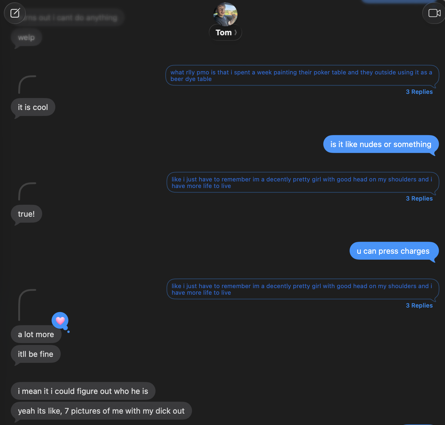 What is your main reason for posting to this thread? Why did you and tom break up? also post more screenshotsI am not alleging anything illegal or saying it was revenge porn or anything, what i meant was he wouldn't ask before and proceed take his phone out mid sexual activity to film I sometimes wouldnt notice till like 15-30 seconds after he started filming. I have no idea if this is illegal or not but yeah he wouldnt ask before. reached out to an ex gf of his, he would do the same thing to her. the blackmail he has on his computer is phone calls and texts i believe, most of them are from his ex girlfriend named Kai. Here is a picture from when we matched on tinder, dont have the messages from when we matched anymore