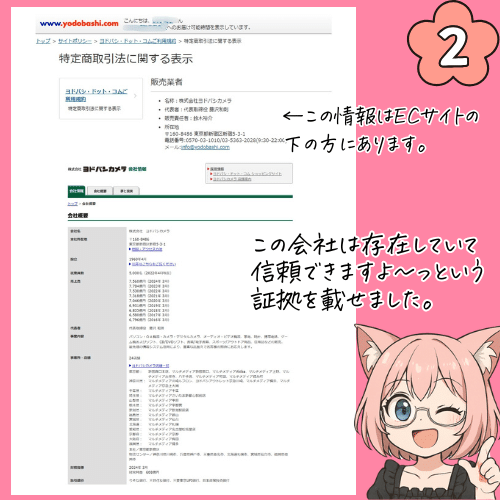(2ページ目)仕入れ先の特定商取引法に基づく表示のスクリーンショットと会社概要