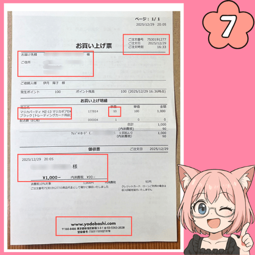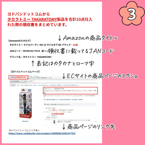 この場合「ヨドバシドットコムからタカラトミーTAKARATOMY製品を合計10点仕入れた際の領収書をまとめています。」