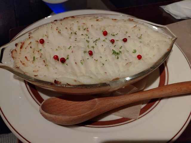 フィッシャーマンズパイは、魚介の旨味がしっかり効いたベシャメルソースとマッシュポテトの組み合わせが絶妙。グリルで香ばしく仕上げられていて、優しい味わいながら満足感あり。