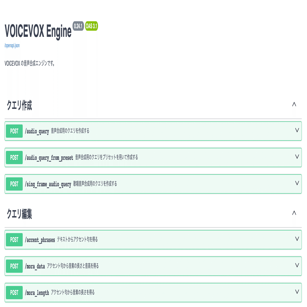 起動後に http://localhost:50021/docs にアクセスして以下のような画面が表示されたら成功です。