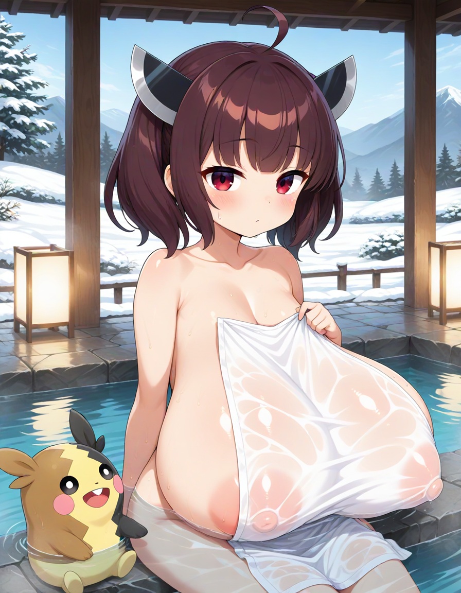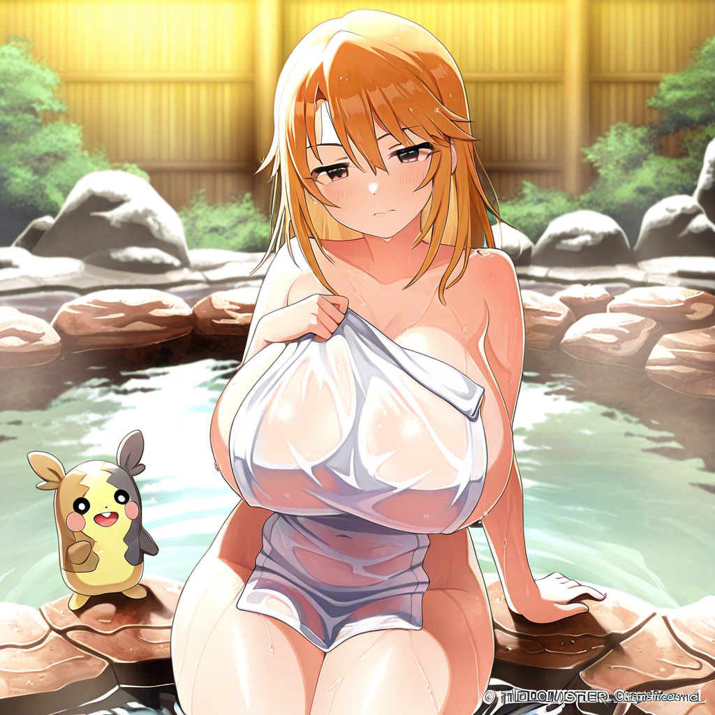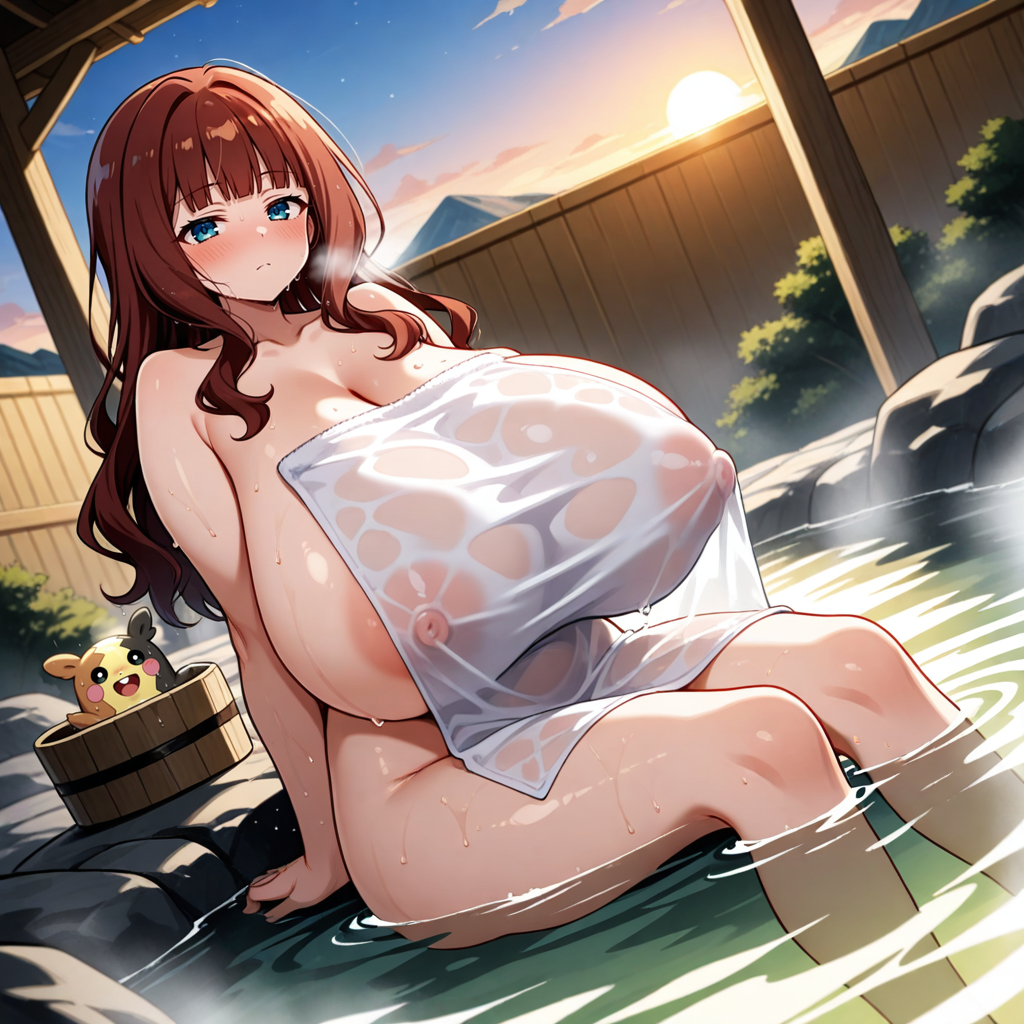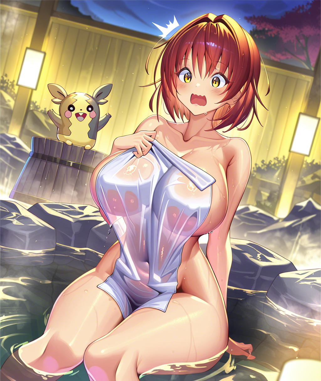 温泉回ペコ!onsen, nude cover, wet, see-through clothes, partially submerged, sitting,
