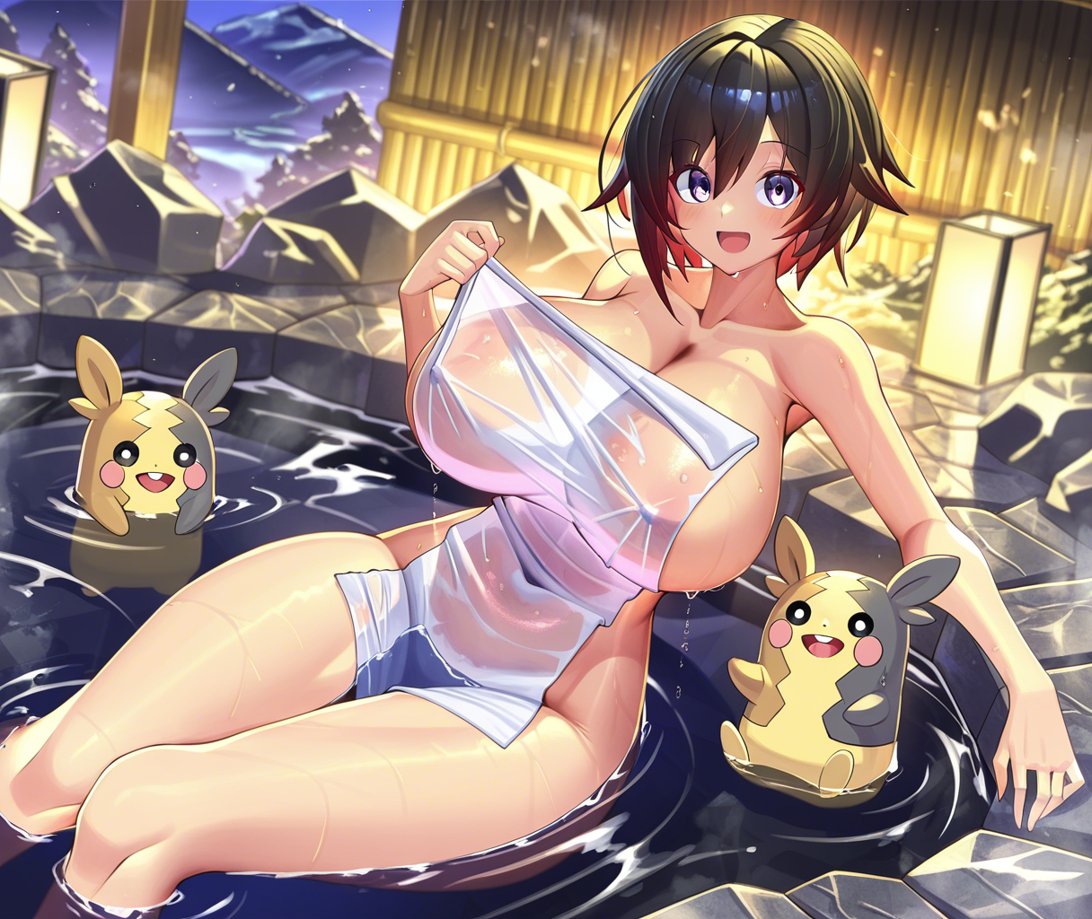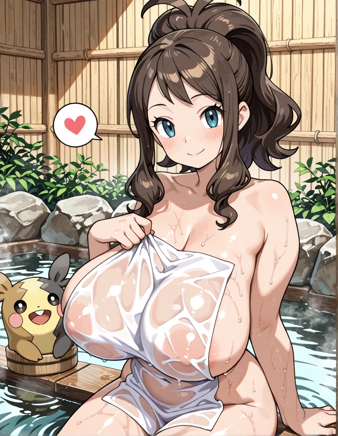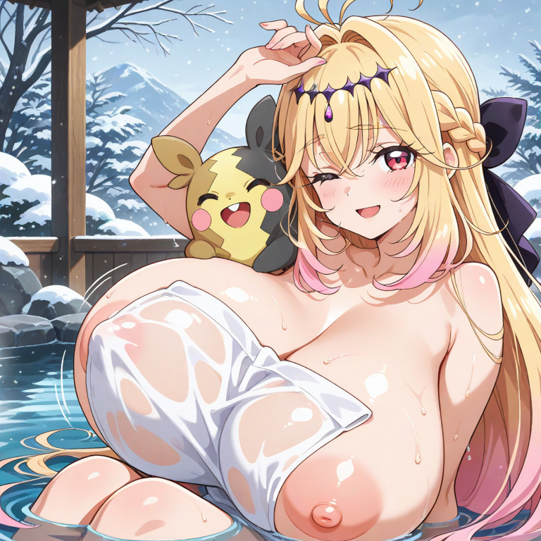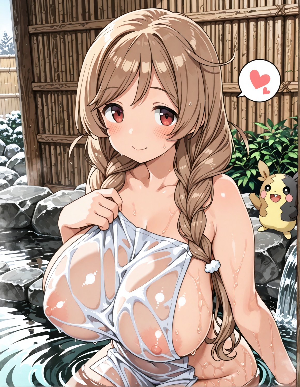 温泉回ペコ!onsen, nude cover, wet, see-through clothes, partially submerged, sitting,
