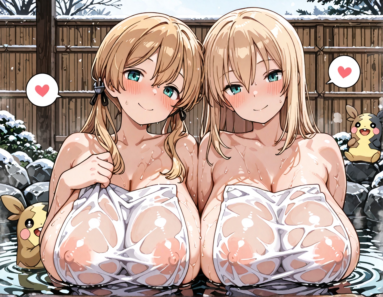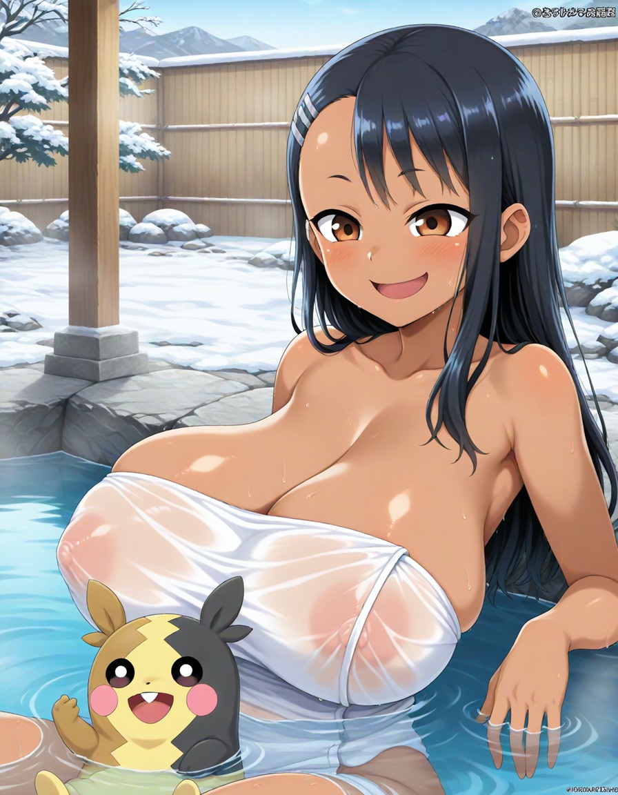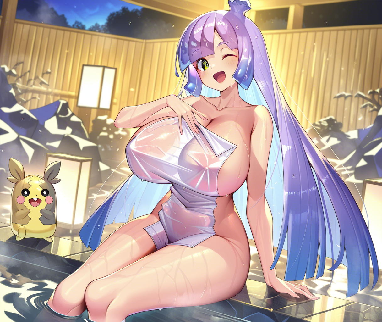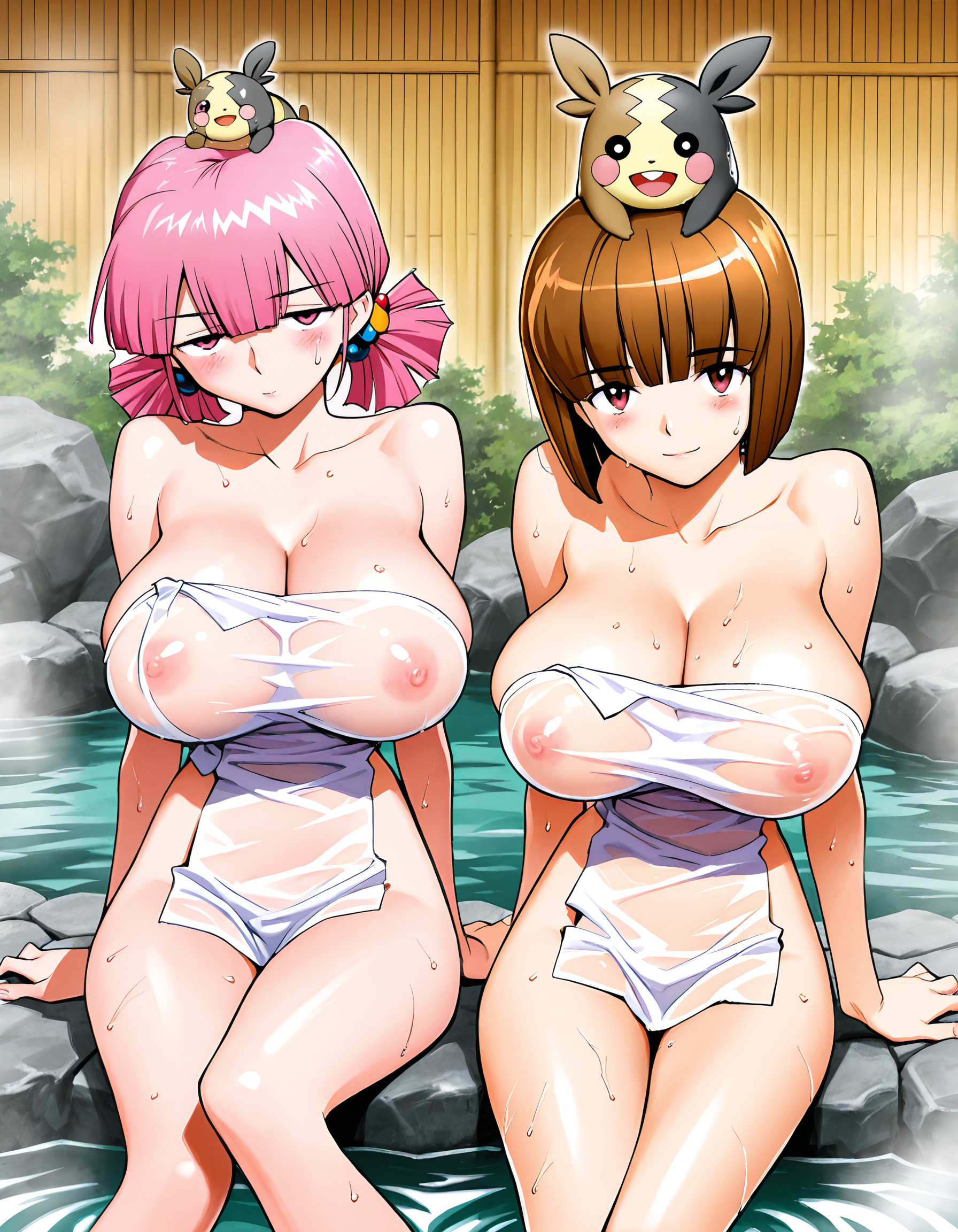 温泉回ペコ!onsen, nude cover, wet, see-through clothes, partially submerged, sitting,
