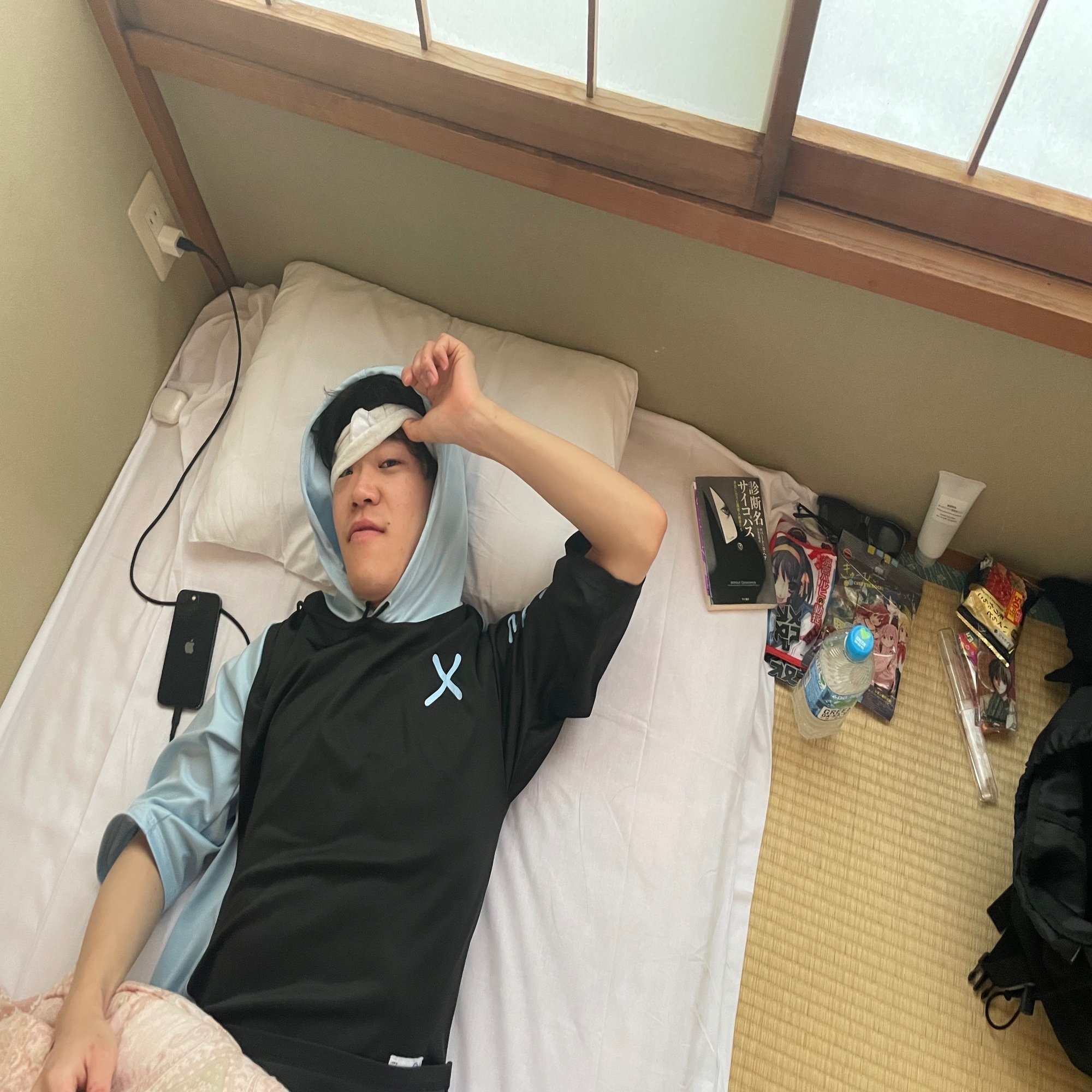 ちなみにこの画像、実は撮り直したもので、最初すでにみくのしんさんの声で覚醒していた鎧坂さんにカメラを向けると寝たままポーズをキメたのでそこで一枚写真を撮ったのだが、その直後に「あっ待って!これでもう一枚!」と言ってバタバタとアイマスクを身につけ、このように五条悟をやってくれた。