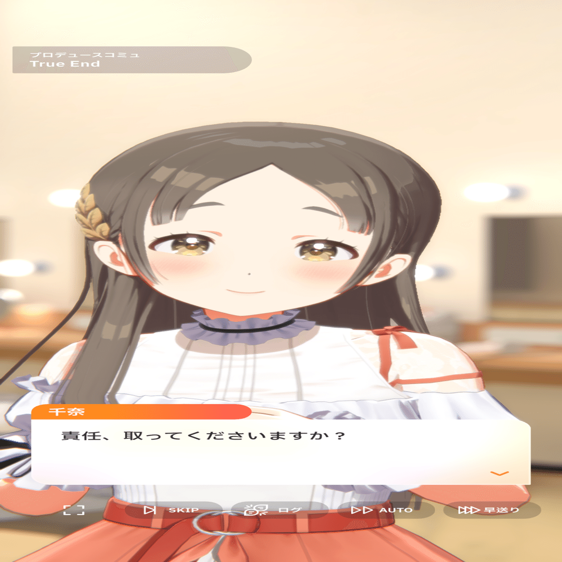 そしてトゥルーエンドでは、そんな倉本千奈から今度はプロデューサーに対して、ダメな自分を立派なアイドルへとプロデュースした責任をとるようお願いされる。