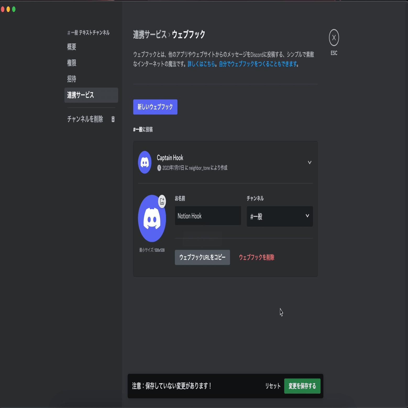 通知を送りたいDiscordのチャンネルにWebHookの作成を行いURLをメモ
