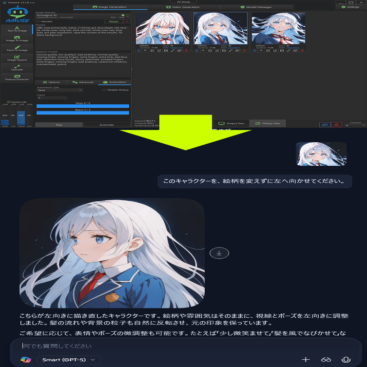 ②出来た画像をcopilotに渡して、テキストでポーズなどの指定