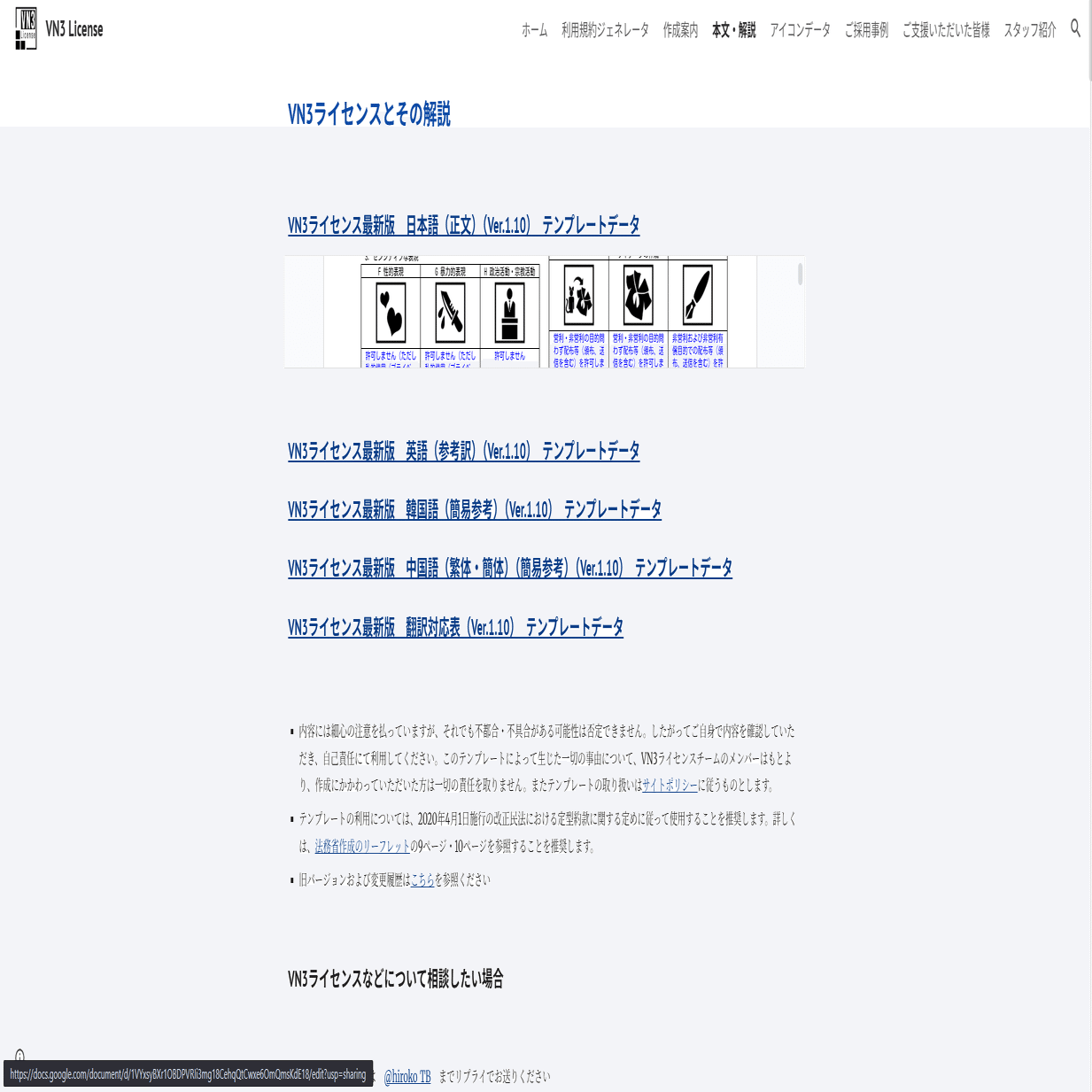 The VN3 license was created assuming that Japanese law applies and that the right-holder is located in Japan. If you are a right-holder residing outside of Japan, we recommend that you avoid using this license as it is. The templates and icons under this license are available to the public free of charge, so we recommend that you devise your own way to use them by the legal system and jurisdiction of your country. If you wish to use the generator, you should indicate in the special notes section that you want to change the governing law and jurisdiction.