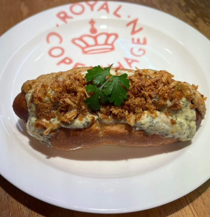 力強く美味しいフライドブラートヴルストソーセージ。レタス、ミックスベジタブル、ハンセンオリジナルハーブソース、イタリアンマスタード、フライドオニオン。