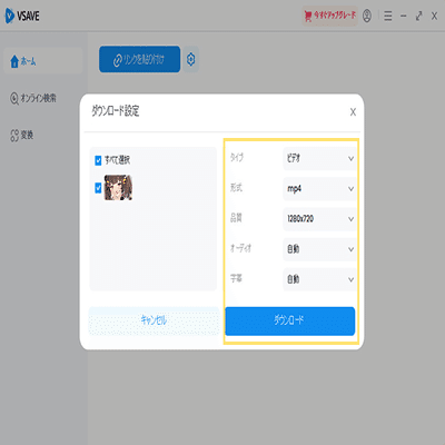ステップ3.Vsaveを開き、「リンクを貼り付け」をクリックします。動画の出力形式、品質、音声トラックなどを設定し、「ダウンロード」をクリックします。