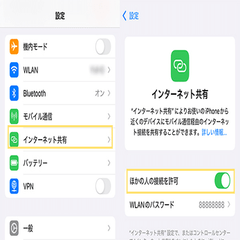 ステップ1.スマホの設定から「テザリング」や「インターネット共有」を有効にします。