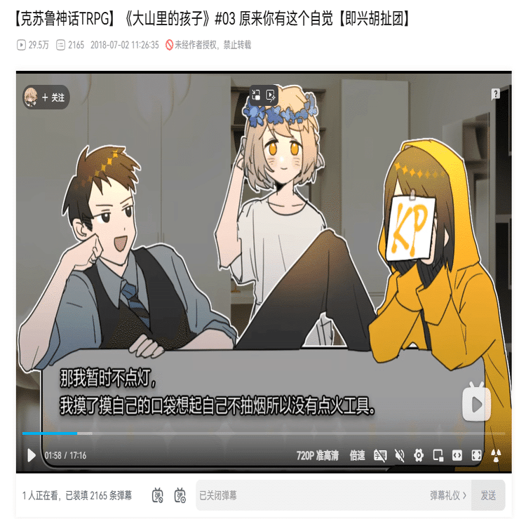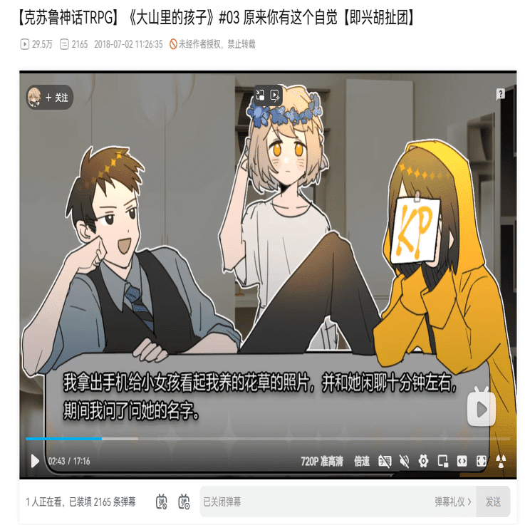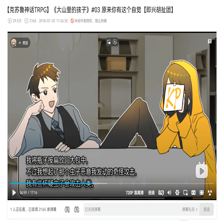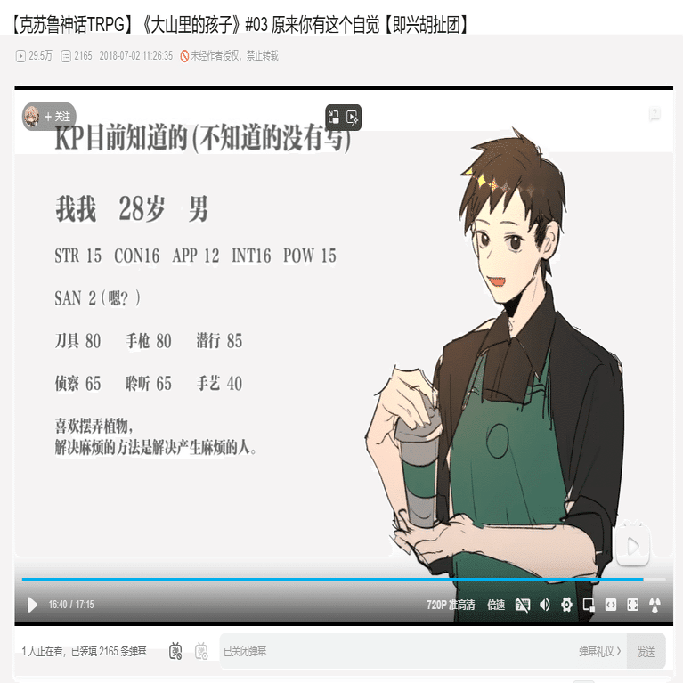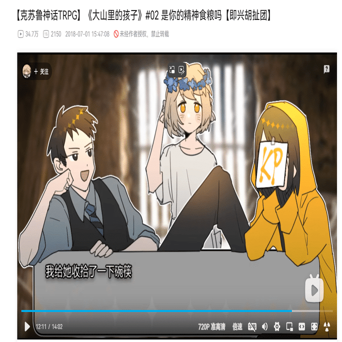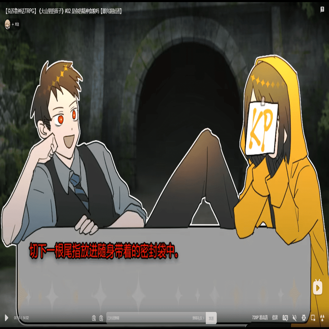 KPは粥先生で、PLは「阿树」さんです。粥先生自身はKPがあまり上手ではなかったので、「大山里的孩子」は粥先生がKPを務めた2つ目のTRPGモジュールでした(「大山里的孩子」は粥先生と阿树さんの雑談から思いついたもので、「我我」の技能ポイントも全てその場で決められました)。 阿树さんは粥先生の友人です。 ちなみに、中国では「大山里的孩子」はよく「貧困山間部の子供」を指します。おそらく山間部は電気が通じにくい(貧困地域の多くは未電化)ためだと思います。「大山里的孩子」(モジュール設定の話です)という設定も、粥先生と阿樹さんが「現代都市でどうやってアザトースを召喚するか」を話し合っている時に即興で考え出したものです 中文:kp是粥先生,pl是“阿树”,粥先生自己不怎么会当kp,所以“大山里的孩子”是粥先生当kp的第二个TRPG模组(“大山里的孩子”是粥先生和阿树聊天时想出来的,所以“我我”的技能点也全是现场定下来的)阿树是粥先生的朋友 顺便一提,在中国,“大山里的孩子孩子”经常指“贫困山区的孩子”,我想大概是因为大山里面不容易通电(贫困地区大部分没有通电),“大山里的孩子”(指模组设定)也是粥先生和阿树在讨论“在现代都市里怎么召唤阿撒托斯”时现场编出来的