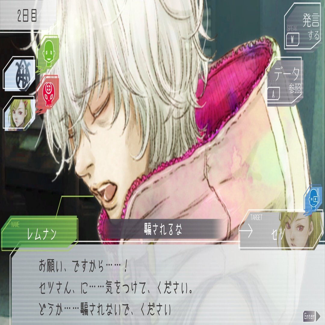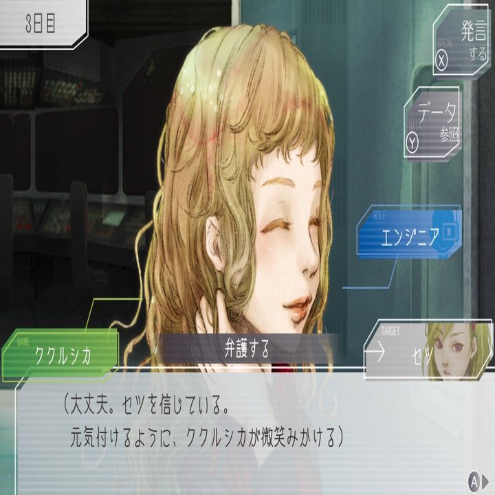 余談ですが「かばう」のコマンドは、議論最終日に「絶対に敵」と分かっている乗員一人+他の二人の三人が残った時、人間二人が交互に「かばう」コマンドを連打する様子がよく見られます。