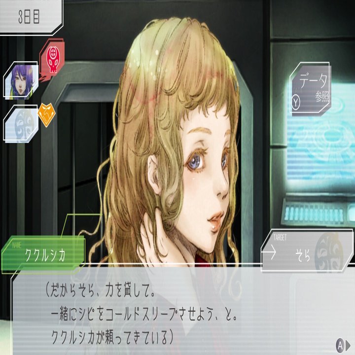 ククルシカは言葉を喋らず身振り手振りで意見を伝えることから、メッセージウィンドウに表示されるのは第三者から感じ取ったククルシカの気持ちになっています。その影響もあってか、はたまた生来の性質もあってか、ククルシカの他人を疑う時や嫌いな相手への対応はわりと攻撃性が高いです。