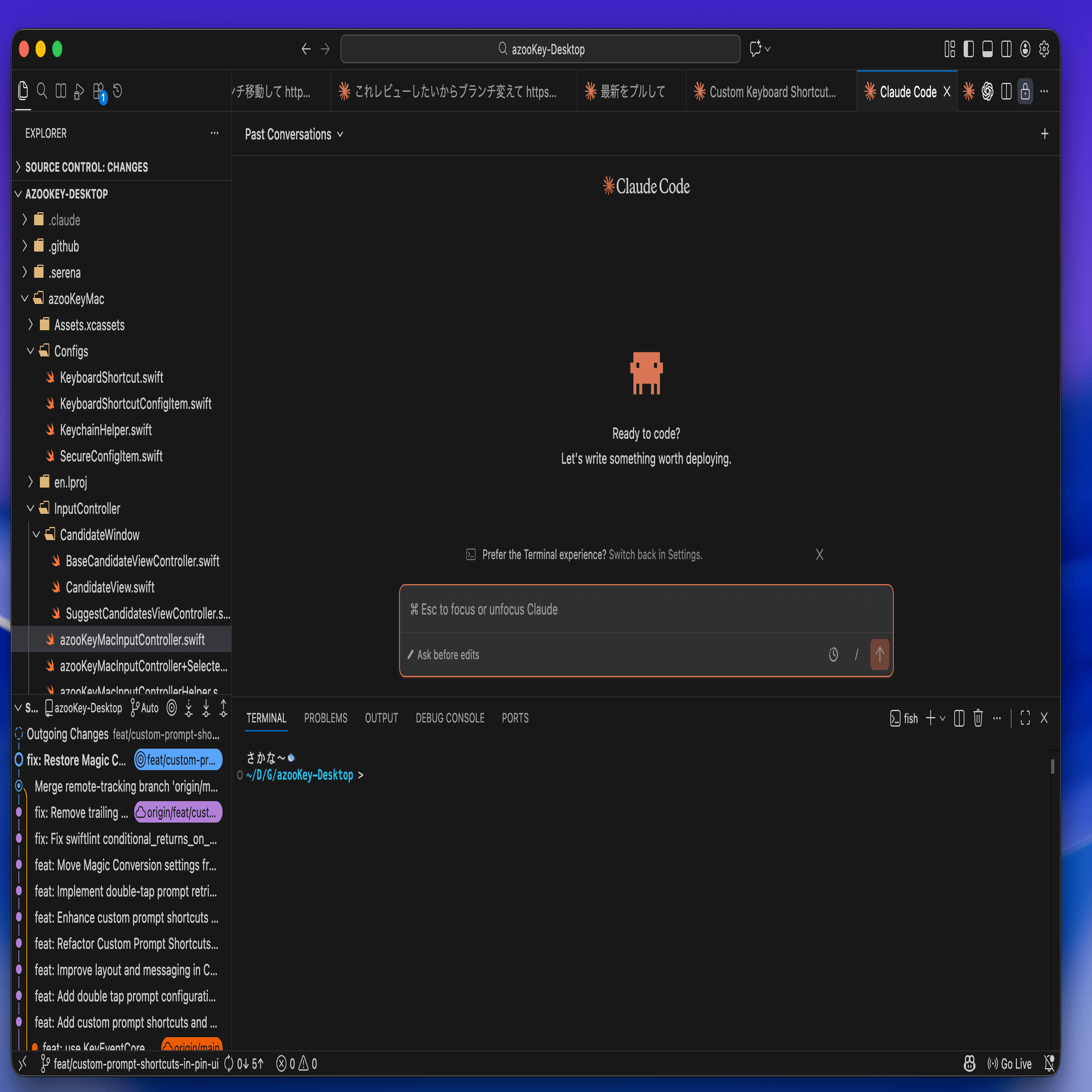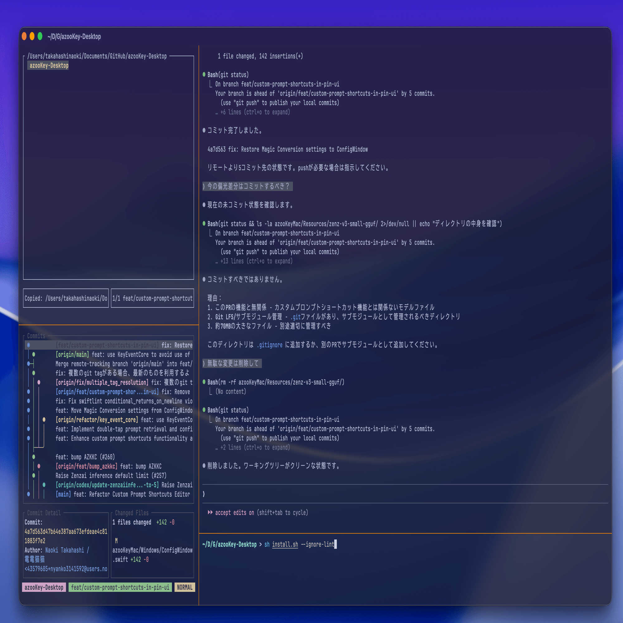 あとDiff見られないのも好み。別にDiff見たいならメインの右上の画面でdiff叩くから、サイドバーにその機能は不要だと思ってる。もしもそれが欲しいならLazyGitのほうがいいかな。自分も大きい画面でDiff見るならLazyGit使うし。
