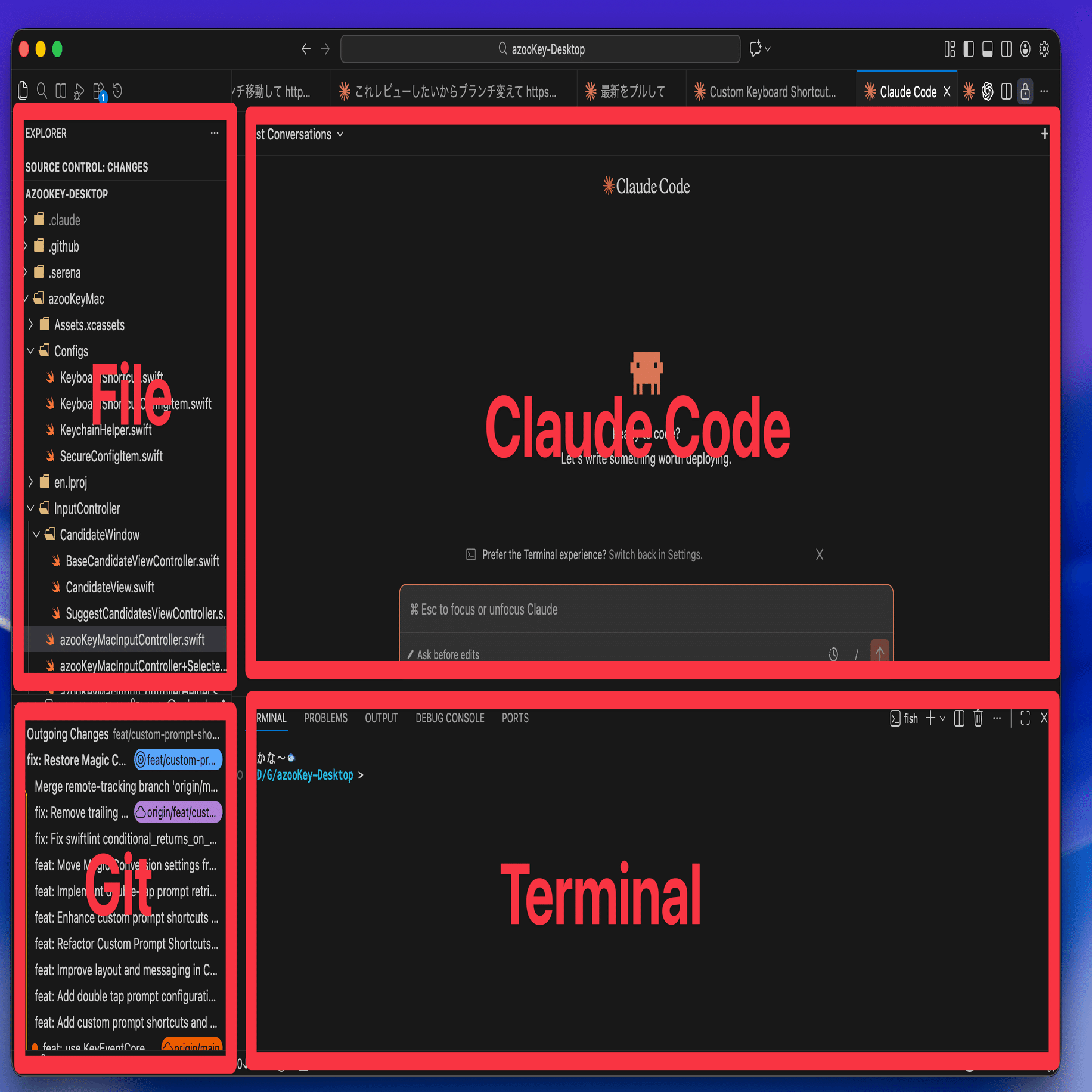 詳しく見ていきましょう。まずVSCodeのほうですが、簡単にはこれです。一般的な部類だと思いますが、左のサイドバーにファイル一覧とGitのTree表示。右にはClaude Code or Code Editorとその下にターミナルという基本構成です。