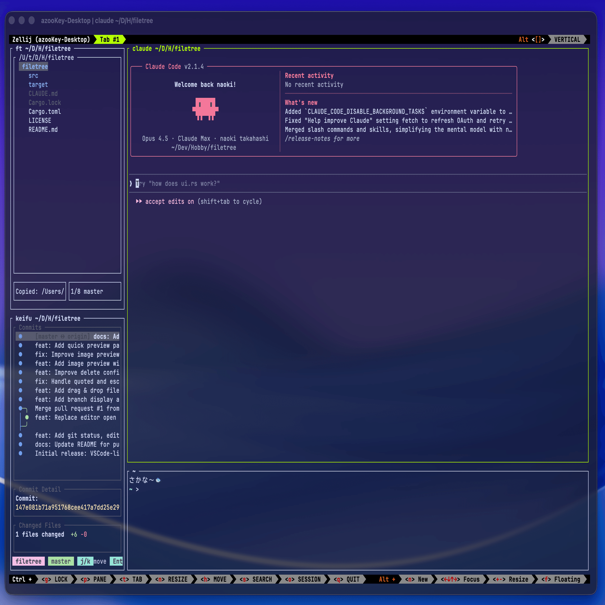 使ってるのは基本は普通の画面分割(Ghostty標準機能)とFileTree(自作)とKeifu(会社の同僚作)のツールです。これでほぼほぼの機能を網羅して使えます。高頻度で使っているプロジェクトに関してはzellijのsessionに持ってます。