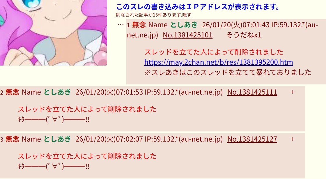 | … | PLAY 92 無念 Name としあき 26/01/20(火)15:16:23 No.1381491821 delそうだねx1プリキュアがんばえー |