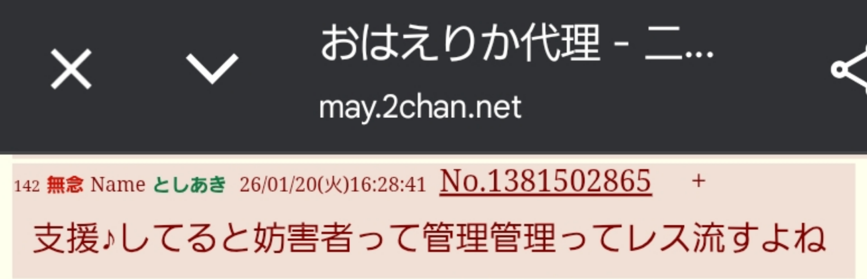 | … | PLAY 143 無念 Name としあき 26/01/20(火)16:30:22 No.1381503075 delそうだねx1>支援♪してると妨害者って管理管理ってレス流すよね |