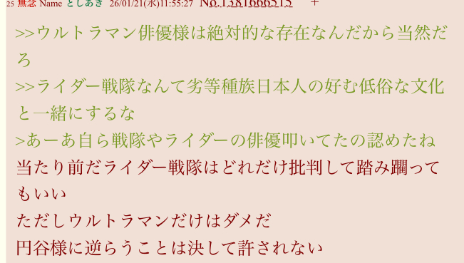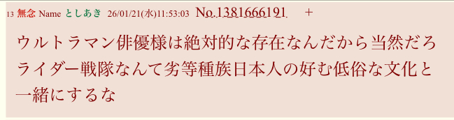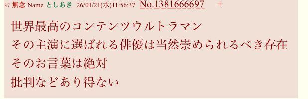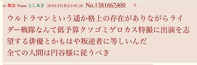 | … | 1無題Name名無し 26/01/21(水)11:58:14 IP:60.102.*(bbtec.net)No.3060842+ 1768964294607.jpg-(108204 B) ウルトラマン信者の本音その1 |