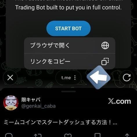 X(Twitter)やアプリ内ブラウザから上のリンクを踏むと、うまくTelegramが立ち上がらないことがあります。 その場合は、以下の手順で「ブラウザ(SafariやChrome)」から開いてください。