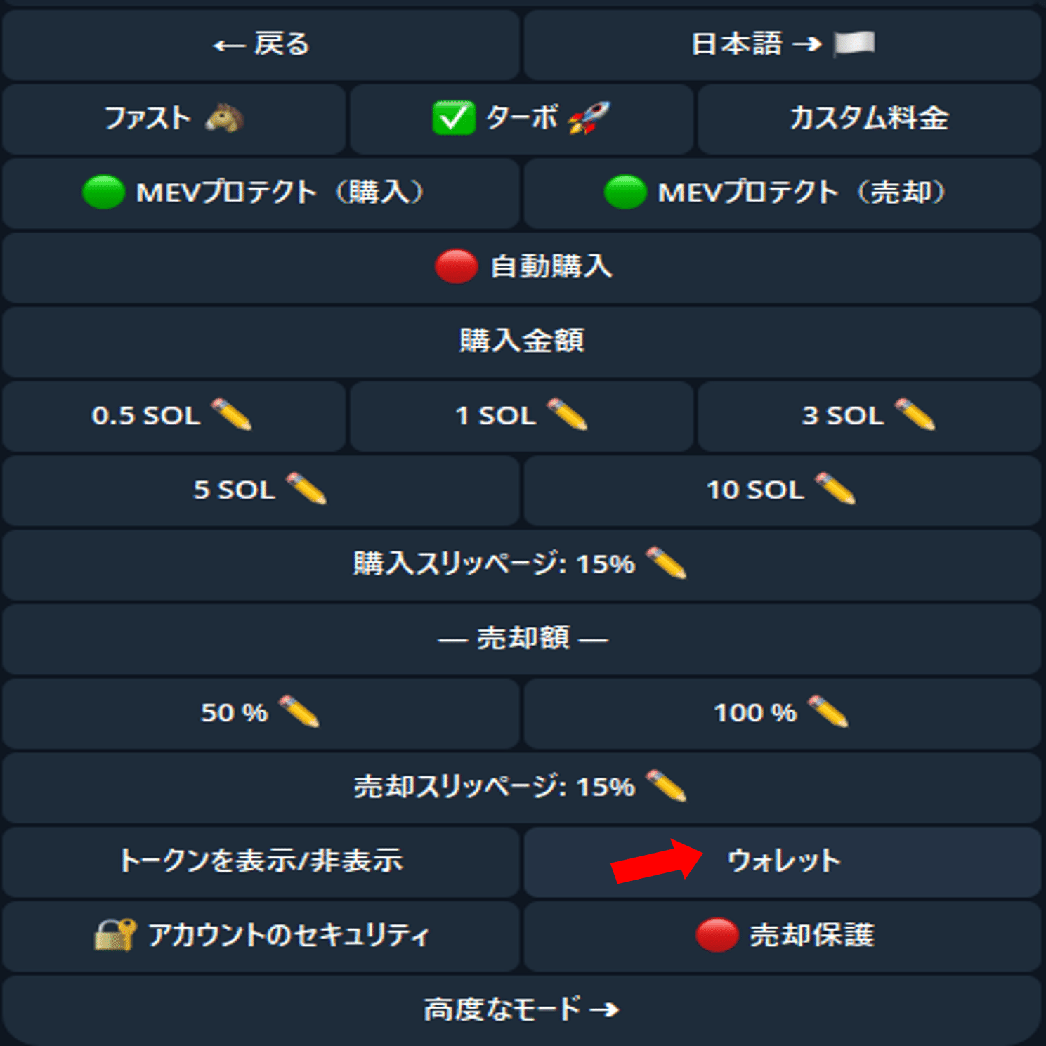 これをONにすると、CA(コントラクトアドレス)をチャットに貼り付けた瞬間、確認画面なしで買い注文が飛びます。0.1秒の世界で勝つための必須設定です。