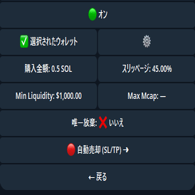 例:0.1 と入力。これで「CAを貼ったら毎回0.1 SOL分買う」設定になります。