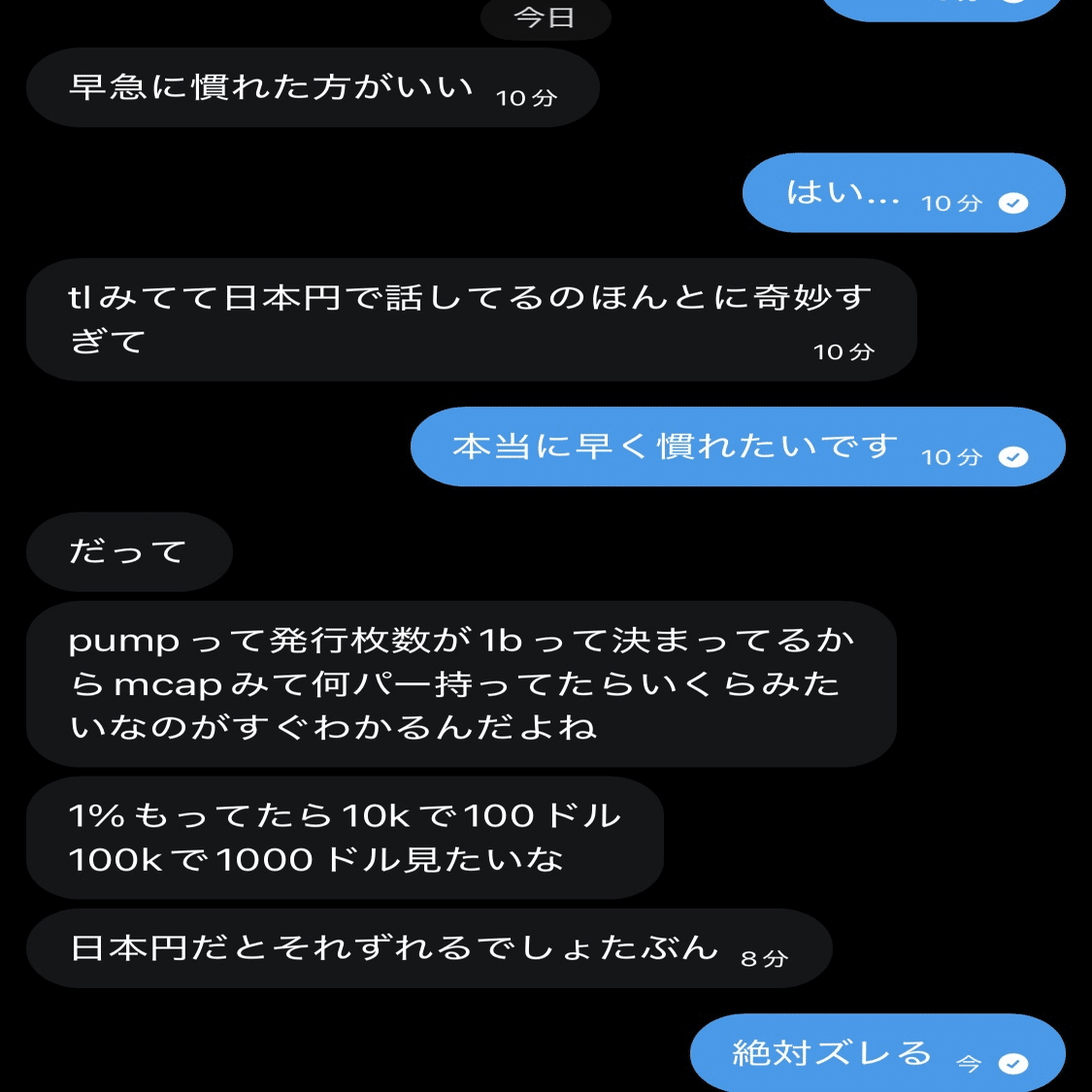 先ほど言った通り、多くのコインは発行枚数が10億枚(1B)です。 すると、どうなるか? このチャットのやり取りを見てください。