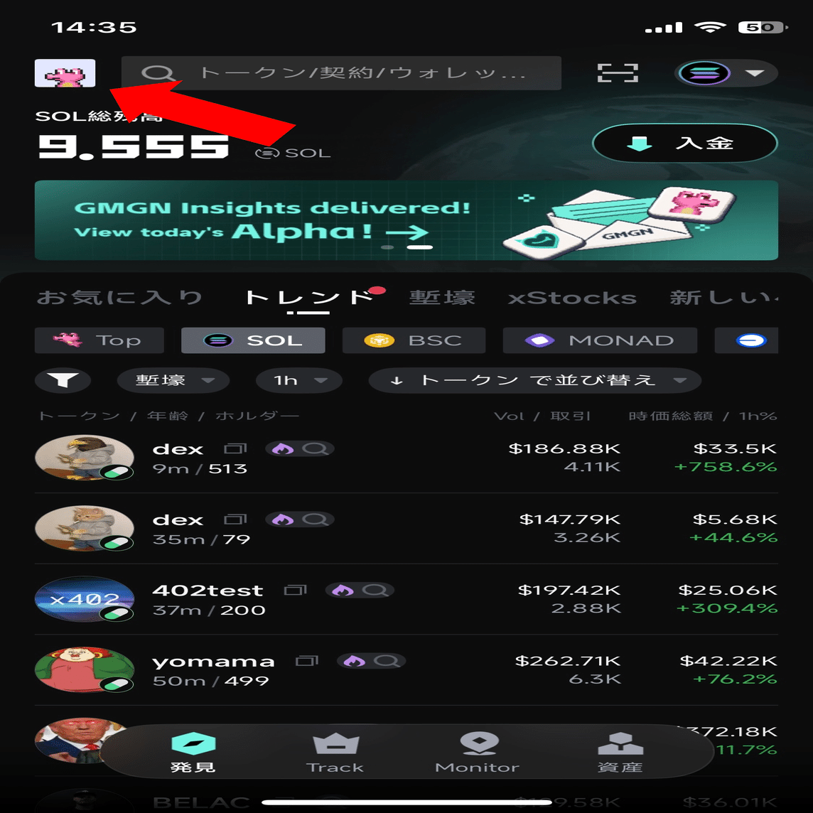 はい、お決まりになってきましたね。アプリのインストールとウォレットのインポートです。先ほどのリンクからGMGNをインストールし、telegramのアカウントなどでログインを済ませてください。そして以下の手順でウォレットをインポートしてください。新規作成する方は手順3で新規作成を選択