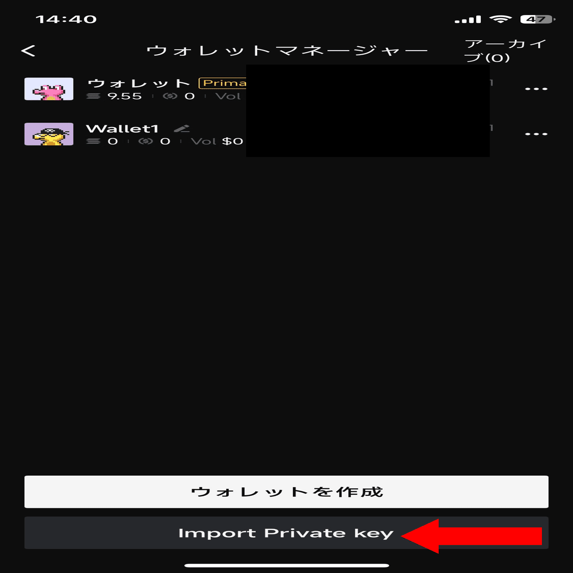 プランBは「ウォレットをインポート」をクリックしてください。秘密鍵が求められるので入力してください。