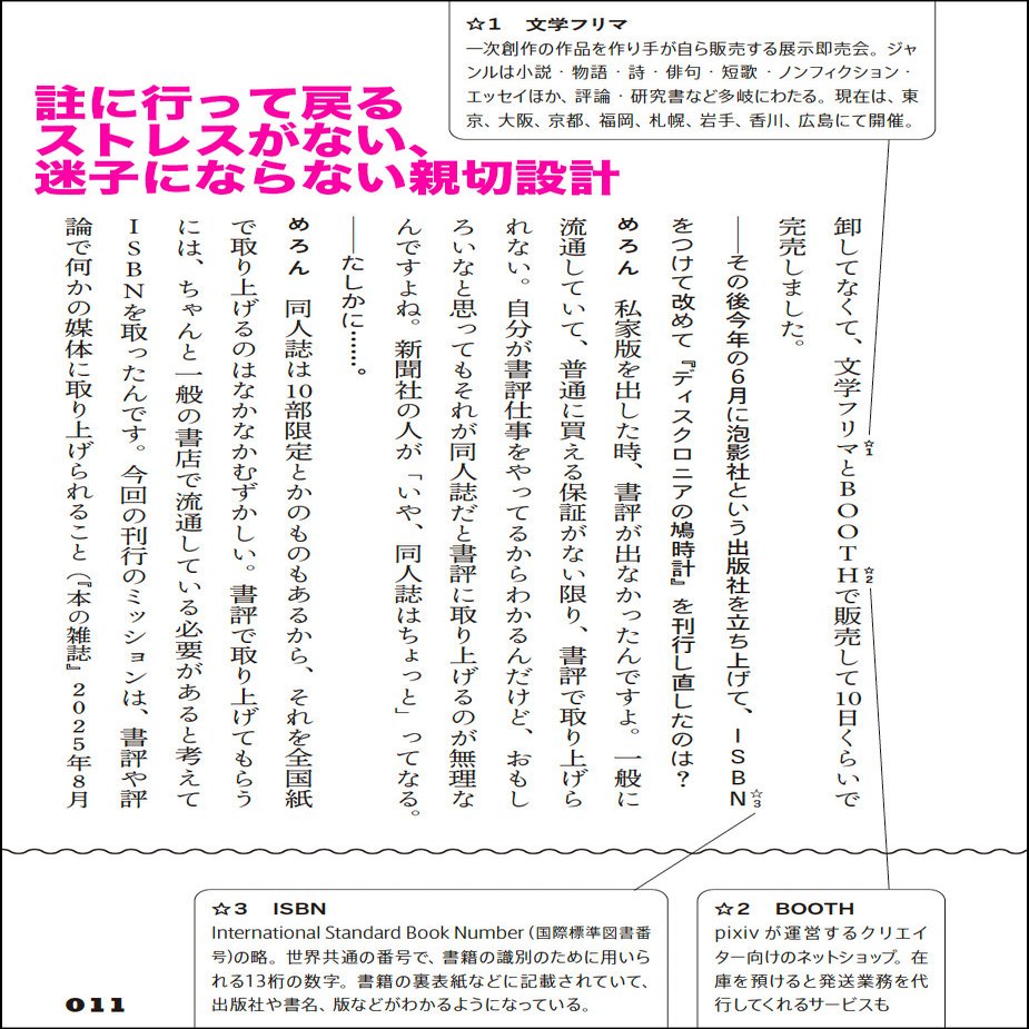 時々出てくる、耳慣れない用語については、同じページに註を入れて、出版流通初心者にも読み進めやすいよう工夫してみました。書き手でありひとり出版も手がける二刀流デザイナー飯村大樹さんの親切設計で、本文と註をストレスなく往復できるデザインになっています。