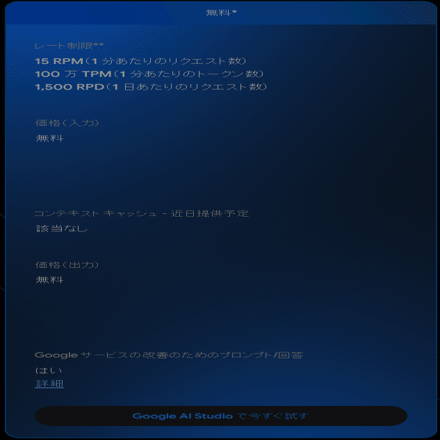 それが1日1500回も使用可能という、出血大サービスです。出血するのはGoogleだけでなく、他のAIプロバイダーも一緒ですが。