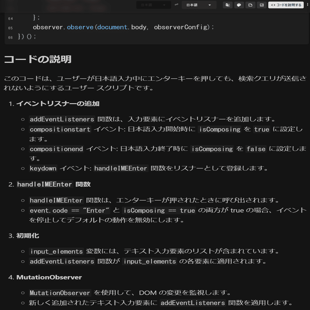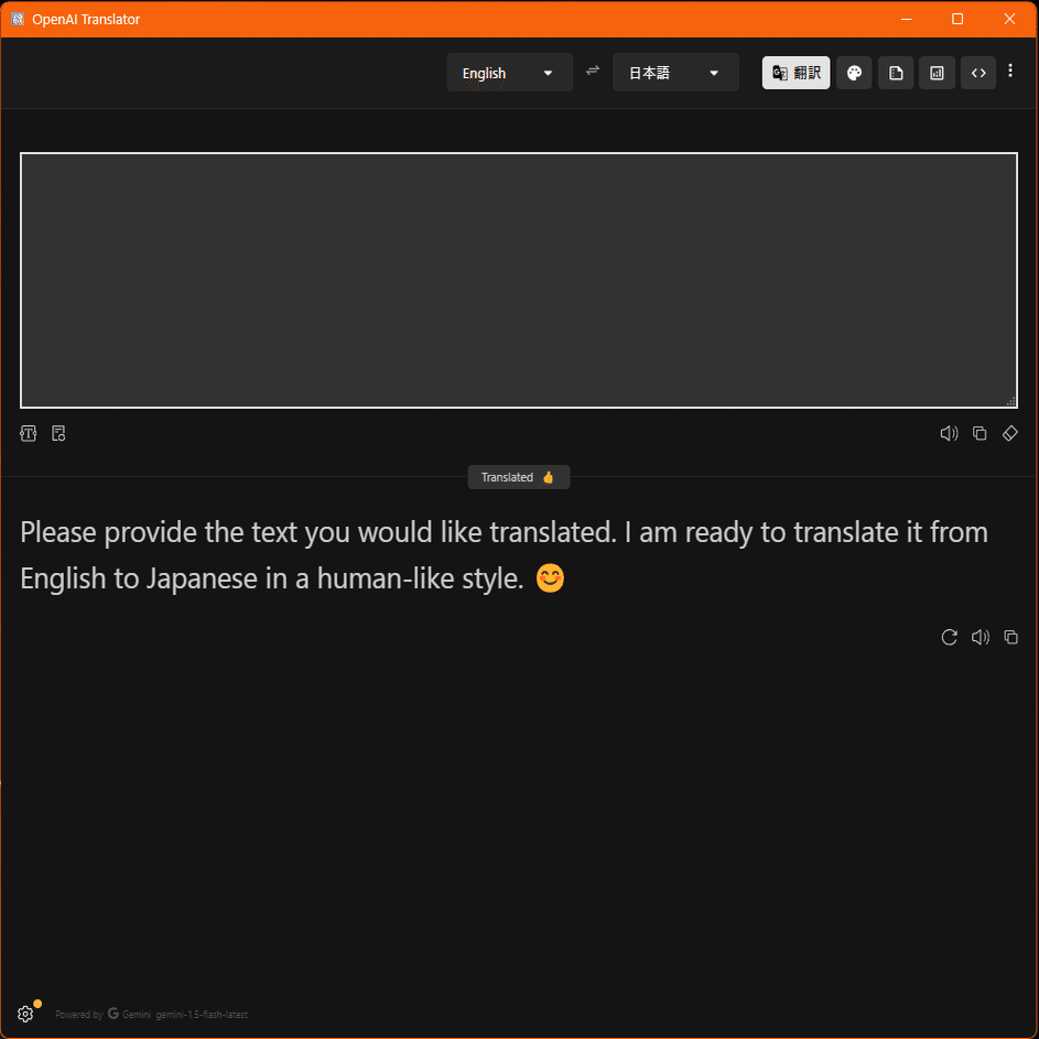 自動翻訳をチェックしておくとEnterキーを押したり、提出ボタンをクリックしないでもOpenAIのグルグルマークをクリックした時点で、翻訳が開始されます。Gemini1.5Flashが実質無料でほぼ使用制限がないことから、これはチェックを入れといていいかと思います。他の有料APIを使用するときなどは外しておきましょう。API死のリスクがあります。