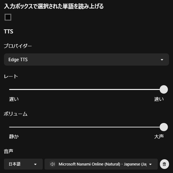 プロバイダーはEdge TTSとSystemdefaultが選択できますが、Edge TTSで良いと思います。MicrosoftEdgeのonlineTTSなので特に問題はないかと思います。