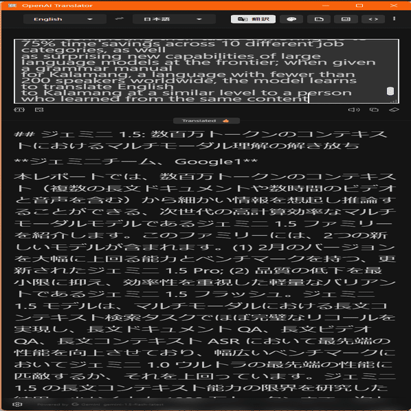 翻訳したい文字をドラッグして選択すると右下にOpenAIのグルグルマークが表示されます。これをクリックすると翻訳ウィンドウがアクティブになり、